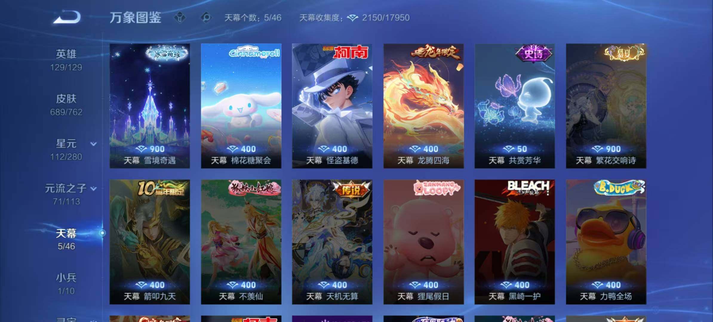 小乔青蛇,大乔白蛇,瑶遇见神鹿,娜可露露晚萤,伽罗箭羽风息,李元芳逐浪之夏,不知火舞魅语,公孙离无限星赏官,大乔猫狗日记,孙策猫狗日记,阿轲节奏热浪,露娜紫霞仙子,诸葛亮黄金分割率,王昭君偶像歌手,韩信白龙吟,项羽苍穹之光,孙尚香时之恋人,阿轲暗夜猫娘,雅典娜冰冠公主,吕布末日机甲,鲁班七号电玩小子,蒙犽龙鼓争鸣,橘右京修罗,墨子龙骑士,嬴政摇滚巨星,刘禅绅士熊喵,刘禅天才门将,白起星夜王子,安琪拉心灵骇客,安琪拉时之奇旅,程咬金功夫厨神,刘邦德古拉伯爵,兰陵王暗隐猎兽者,曹操幽灵船长,宫本武藏鬼剑武藏,司马懿暗渊魔法,亚瑟心灵战警,钟馗乐园奇幻夜,杨戬天秀·启明,蔡文姬舞动绿茵,廉颇地狱岩魂,西施诗语江南,小乔缤纷独角兽,夏侯惇乘风破浪,花木兰水晶猎龙者,铠曙光守护者,百里玄策热力回旋,墨子金属风暴,百里玄策原初追逐者,吕布圣诞狂欢,貂蝉圣诞恋歌,百里守约特工魅影,嬴政暗夜贵公子,嫦娥拒霜思,雅典娜黎明之约,李白千年之狐,哪吒雪上飞焰,澜赏金猎手,艾琳奇遇舞章,高渐离天秀·音浪,张良千筹问战,庄周天秀·幻梦,弈星滕王阁序,阿古朵顽趣,杨玉环银翎春语,刘备百相守梦,关羽百相守梦,沈梦溪匿光破解者,刘禅电玩·爆裂旋风,海月浮梦罗烟,镜真我赫兹,百里守约真我赫兹,李元芳匿光侦查者,姜子牙闲日渔趣,蒙犽百解令,周瑜雪夜绮愿,高渐离燃音魔法,大乔乘龙·忆丹青,安琪拉乘龙·聚宝船,上官婉儿群星魔术团,关羽决胜骁骑,海诺心动手记,李白谪仙醉月,姬小满飞车小橘子,赵怀真器灵·浮梦炉,苍狼魂孤将