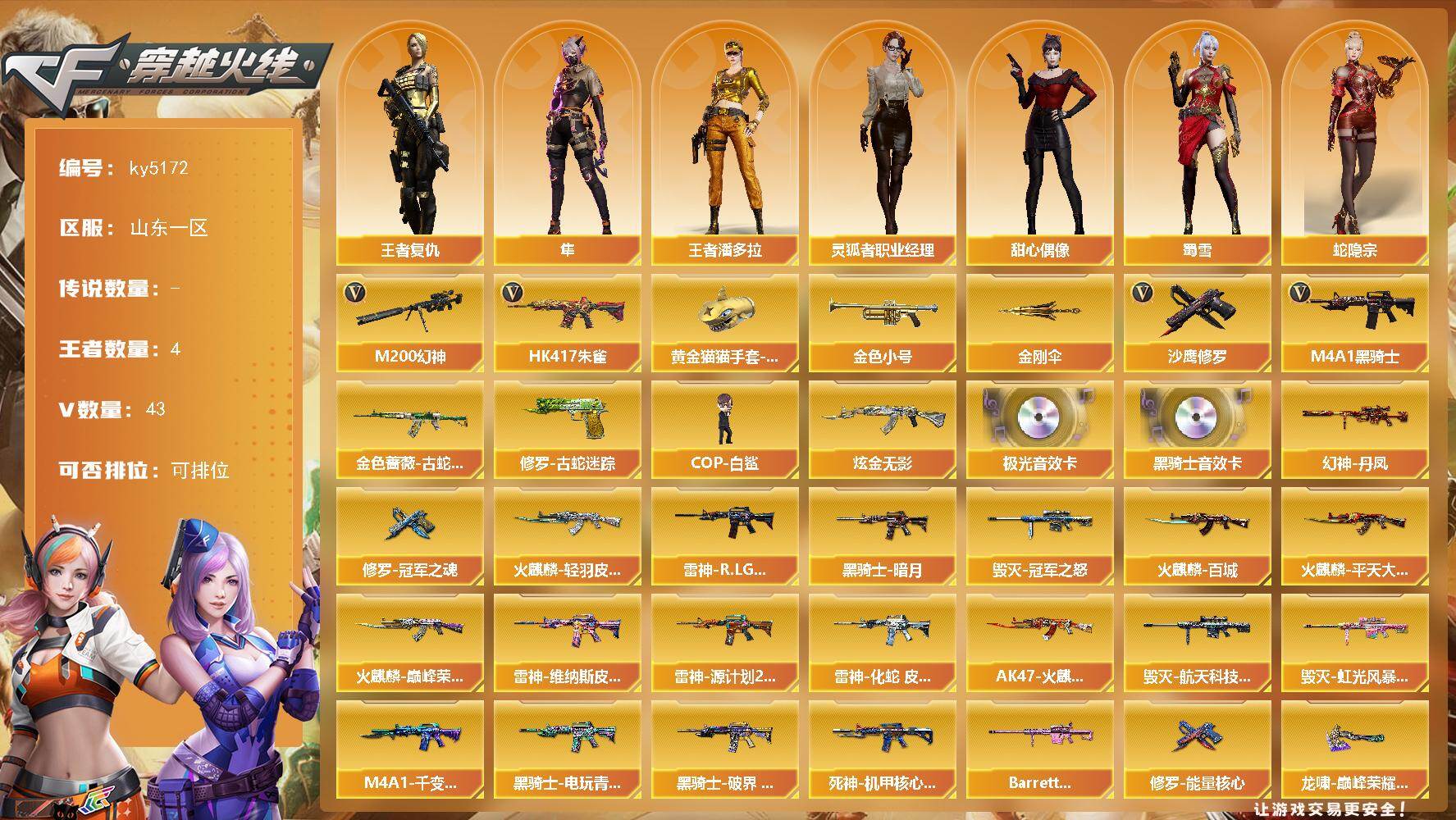 [16333640]山东一区-43V-4王者-1炫金 【热门武器】:HK417-朱雀,M200-幻神*3,金色蔷薇-古蛇迷踪,修罗-古蛇迷踪,金色小号,M4A1-黑骑士*2,COP-白鲨,沙鹰-修罗*2,黄金猫猫手套-白鲨,金刚伞 【王者炫金武器】:炫金无影 【音效卡】:M4A1-黑骑士音效卡*2,Barrett-极光音效卡 【皮肤】:幻神-丹凤,雷神-R.LGD-CFPLS18冠军,雷神-维纳斯皮肤,雷神-源计划2.0专属 皮肤,雷神-化蛇 皮肤,火麒麟-轻羽皮肤,火麒麟-平天大圣*2,火麒麟-百城,火麒麟-巅峰荣耀,AK47-火麒麟-百城23冠军皮肤,毁灭-冠军之怒,毁灭-航天科技皮肤,毁灭-虹光风暴 皮肤,M4A1-千变-孔明皮肤,黑骑士-暗月,黑骑士-电玩青兔皮肤,黑骑士-破界 皮肤,死神-机甲核心皮肤,Barrett-金色蔷薇-蛇姬 皮肤,修罗-能量核心,修罗-冠军之魂,龙啸-巅峰荣耀 皮肤,麒麟刺-甜蜜糖果 皮肤,麒麟刺-萌杀皮肤 【角色】:隼,王者复仇,王者潘多拉,蛇隐宗,乔伊教练,云海玲珑,空,暗夜-X,电竞少女,芳心审判者,风暴女*2,嘉年华灵狐,兰妹妹,0号玩家,灵狐者-职业经理,龙儿,龙儿-小淘气,曼陀罗-X,曼陀罗-礼服,潘多拉-甜心教官,赛斯-X,蛇姬,斯沃特-X,甜心偶像,蜀雪,兔囡囡,新娜塔莎,雪莉杨-摸金校尉,夜玫瑰-幻能朋克,樱-战斗天使 【人偶武器】:COP-白鲨,天龙-曼陀罗,AWM-灵狐-15周年嘉年华,海滩汪汪-巴雷特,COP-旗袍*2,迷你深渊冰龙*8,迷你裂空之翼*5,迷你牛魔王,迷你波特博士*6,夺魂*2,迷你牛牛*3,迷你火种*3,生化手雷-机甲核心,迷你艾比 【暴走生化】:超级对讲机 【挑战大师】:神圣爆裂者III,AK47-冰龙粉碎者,激光毁灭者III-白马银枪,VEPR-12-金魔,激光毁灭者III,机甲撕裂者III,试炼破坏者III,KAC-圣炎切割者III,神圣爆裂者-末日III,阐释者III 【英雄级武器】:AK47-火麒麟,M4A1-雷神,M4A1-黑骑士*2,AK47-黑鲨*2,HK417-朱雀,无影-神兵利器,金色蔷薇-古蛇迷踪,M4A1-猎神,烈火-动感闪耀,超新星-悦享-觉醒版,AK-47-猩红传说,QBZ-03-王者蔷薇-觉醒版,白虎之魄-觉醒版,Barrett-毁灭,Barrett-极光,M200-幻神*3,