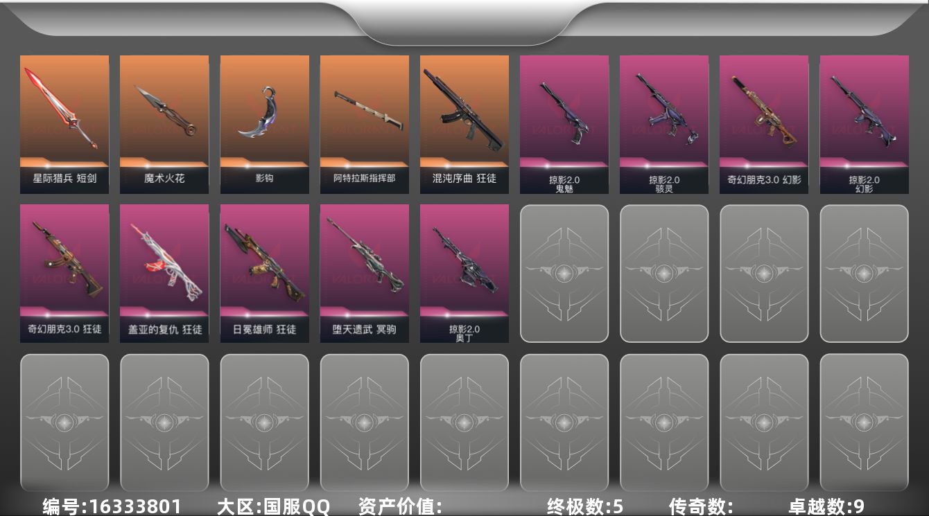 [16333801]【套装】:掠影//2.0套装 【英雄】:幻棱,炼狱,维斯,暮蝶,壹决,捷风,雷兹,不死鸟,贤者,猎枭,零,芮娜,尚勃勒,霓虹,斯凯,夜露,盖可,钢锁 【近战 武器】:近战武器-魔术火花,近战武器-影钩,近战武器-阿特拉斯指挥部 甩棍,近战武器-星际猎兵 短剑,近战武器-魔术火花 【狂徒】:狂徒-混沌序曲,狂徒-盖亚的复仇,狂徒-日冕雄师,狂徒-奇幻朋克//3.0 【幻影】:幻影-掠影//2.0,幻影-奇幻朋克//3.0 【冥驹】:冥驹-堕天遗武 【奥丁】:奥丁-掠影//2.0 【骇灵】:骇灵-掠影//2.0 【鬼魅】:鬼魅-掠影//2.0 【卡面】:VCT CN首冠 卡面,修车达人 卡面,热舞环节 卡面,正义的化身 卡面,无畏契约GO!第一卷:芮娜 卡面,无畏契约GO!第一卷:零 卡面,《双城之战》金克丝 卡面,代号红色 卡面,新兵报到 卡面,V契约 卡面,无畏契约 卡面 【喷漆】:小丑猫 喷漆,熊抱 喷漆,蛋糕还是爆能器? 喷漆,买装还是存钱 喷漆,暴走萝莉 喷漆,胜利属于无畏契约 喷漆,GLHF 喷漆,无畏契约 喷漆 【挂饰】:工具腰带 挂饰,无畏契约GO!第一卷 芮娜 挂饰,无畏契约GO!第一卷 零 挂饰,鱼骨头 挂饰,熔岩灯 挂饰,第九季//第二幕 纪念币 挂饰,Z世代特饮 挂饰,天外飞客 挂饰,红鳞松叶 挂饰,《双城之战》魄罗 挂饰,海豹的认可 挂饰,无畏契约 纪念币 挂饰