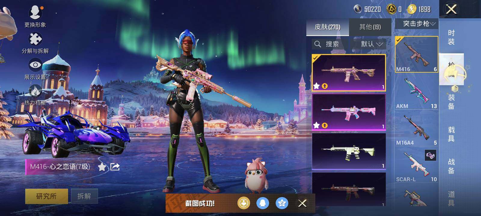 【粉色枪皮】:AKM-梦之光华,SCAR-L-锦绣绵绵,M416-心之恋语,M416-电玩时刻,M762-青锋波束,UMP45-量子极限,Mk14-甜梦熊击,DP-28-豹影疾电,MG3-洛神天依