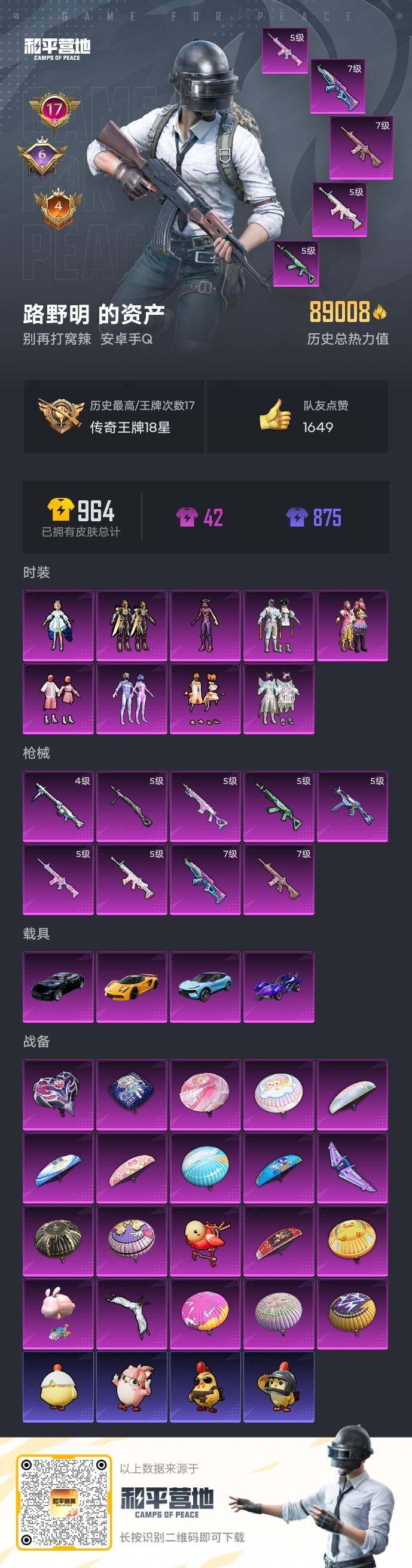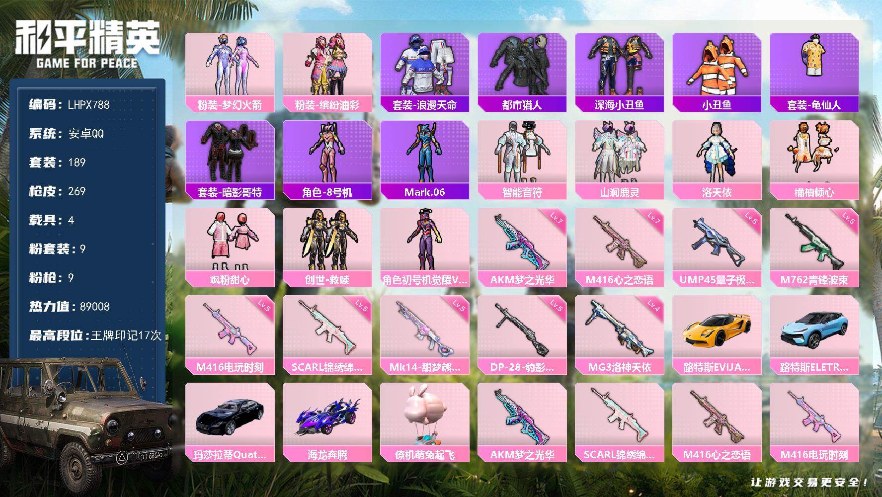 [16334978]【特价出售/店主推荐】安卓 手Q-9粉装-9特效枪-4载具-1僚机-3粉色飞行器-89008热力值-17王牌印记-189套装-269枪皮 【热门品类】:粉装-梦幻火箭,粉装-缤纷油彩,套装-浪漫天命,套装-都市猎人,套装-深海小丑鱼,套装-小丑鱼,套装-龟仙人,套装-暗影哥特,角色-8号机,角色-Mark.06 【粉色套装】:粉装-梦幻火箭,粉装-智能音符,粉装-缤纷油彩,粉装-山涧鹿灵,角色-洛天依,粉装-橘柚倾心,粉装-飒粉甜心,套装-创世·救赎,角色-初号机 觉醒Ver. 【粉色枪皮等级】:AKM-梦之光华(七级),SCAR-L-锦绣绵绵(五级),M416-心之恋语(七级),M416-电玩时刻(五级),M762-青锋波束(五级),UMP45-量子极限(五级),Mk14-甜梦熊击(五级),DP-28-豹影疾电(五级),MG3-洛神天依(四级) 【粉色载具】:路特斯EVIJA(星际黄),路特斯ELETRE(冰川蓝),玛莎拉蒂Quattroporte(夜幕蓝),海龙奔腾,僚机-萌兔起飞 【粉色枪皮】:AKM-梦之光华,SCAR-L-锦绣绵绵,M416-心之恋语,M416-电玩时刻,M762-青锋波束,UMP45-量子极限,Mk14-甜梦熊击,DP-28-豹影疾电,MG3-洛神天依 【粉色飞行器】:梦幻火箭飞行器,天之羽翼飞行器,歌者泠鸢飞行器 【粉色降落伞】:绝对恒星降落伞,百万伏特降落伞,梦幻火箭降落伞,林间仙鹿降落伞,洛神天依降落伞,蓝莓炮弹降落伞,垂柳戏鸭降落伞,歌者泠鸢降落伞,暗夜鎏金降落伞,音爆索尼克降落伞,仲夏莫吉托降落伞,飒粉甜心降落伞,未来歌姬降落伞,莲影清波降落伞,蜜语绒猫降落伞,罪夜之冕降落伞 【稀有套装】:套装-龟仙人,套装-雪国风尚,套装-雏菊兔兔,套装-萝兰蝴蝶,套装-云朵鹅,套装-雪绒豹,角色-灵公主,角色-乐音,套装-朱霞炽焰,套装-凌霄紫焰,角色-申公豹,套装-书海巡游,套装-画境星梦,套装-琴音绮想 【稀有枪皮】:AKM-奇异狩猎者,AKM-彩虹符号,AKM-影袭,AKM-生命誓言,AKM-百万伏特,AKM-破晓战魂,AKM-缤纷海域,AKM-萌趣颜团子,AKM-虎虎生威,AKM-霓虹街区,AKM-龙的传人,M16A4-幻世战舞者,M16A4-甜心亚梦,M16A4-红色方程式,M16A4-蓝色火焰,SCAR-L-炫彩节奏,SCAR