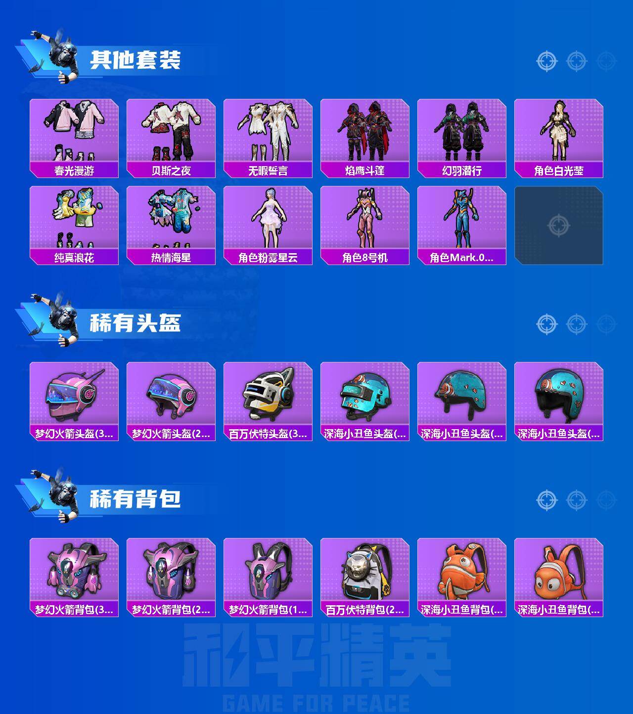 - [13196716]素材身法号 苹果 手Q-4神装-14粉装-19特效枪-8载具-10粉色飞行器-11.5w热力值-14王牌印记-220套装-311枪皮【红色神装等级】:魔童闹海-哪吒(一级),圣域龙灵-瑞拉(一级),幽焰骑士-维塔(一级),沙丘之主-图卡盟(二级)【热门品类】:粉装-怪诞乔克,粉装-梦幻火箭,粉装-音爆索尼克,套装-深海小丑鱼,套装-小丑鱼,角色-军刀雅典娜,套装-龟仙人,小丑红鼻头,套装-红熊茄茄【粉色载具】:路特斯ELETRE(花绽灰),宝马M4(圣保罗黄),迈凯伦570S(天际蓝),Formula E Gen2(幽光蓝),踏焰逐风摩托车,僚机-萌兔起飞,星梦玉骢,护世瑞兽【粉色套装】:粉装-怪诞乔克,粉装-梦幻火箭,粉装-麻辣鲜香锅,粉装-新星烈龙,粉装-草莓生巧,粉装-馨动时刻,粉装-暗夜玫瑰,粉装-音爆索尼克,粉装-莲影清波,角色-脆鲨七海,粉装-幻彩电音,角色-绯穹魔姬,角色-羊梦糖心【粉色枪皮等级】:AKM-梦之光华(五级),AKM-幽焰骑士(三级),SCAR-L-纯梦嫁纱(四级),SCAR-L-魔童闹海 哪吒(三级),M416-心之恋语(七级),M416-女娲灵识(三级),AUG-超新星(五级),Vector-绯穹魔姬(四级),AKS-74U-信仰神谕(四级),P90-仙履奇缘(四级),Kar98K-巳巳如意(五级),Kar98K-圣域龙灵(三级),AWM-天使羽翼(四级),AMR-智耀战神(四级),DP-28-豹影疾电(五级),MG3-洛神天依(四级),平底锅-喜羊羊与灰太狼(一级),烟雾弹-甜梦果泡(三级),破片手榴弹-瓶中星球(七级)【粉色飞行器】:纯梦嫁纱飞行翼,超新星飞行器,沙丘之主天马,镜域双华-灵镜之阶,龙翔九天飞行器,幽焰列车飞行器,脆鲨七海飞行器,万象金身飞行器,圣域金龙飞行器,飞天猪飞行器
