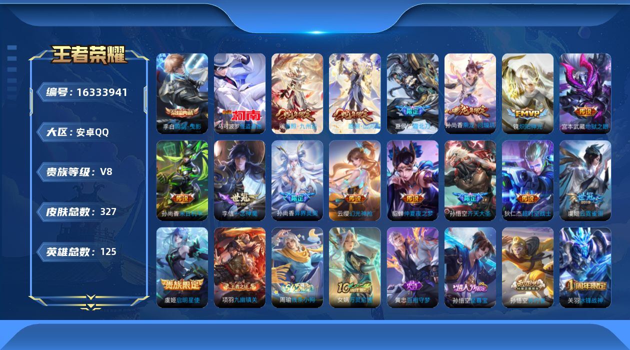 [16333941]安卓Q-V8-125英雄-327皮肤-1典藏皮肤-1珍品传说-15传说-88史诗