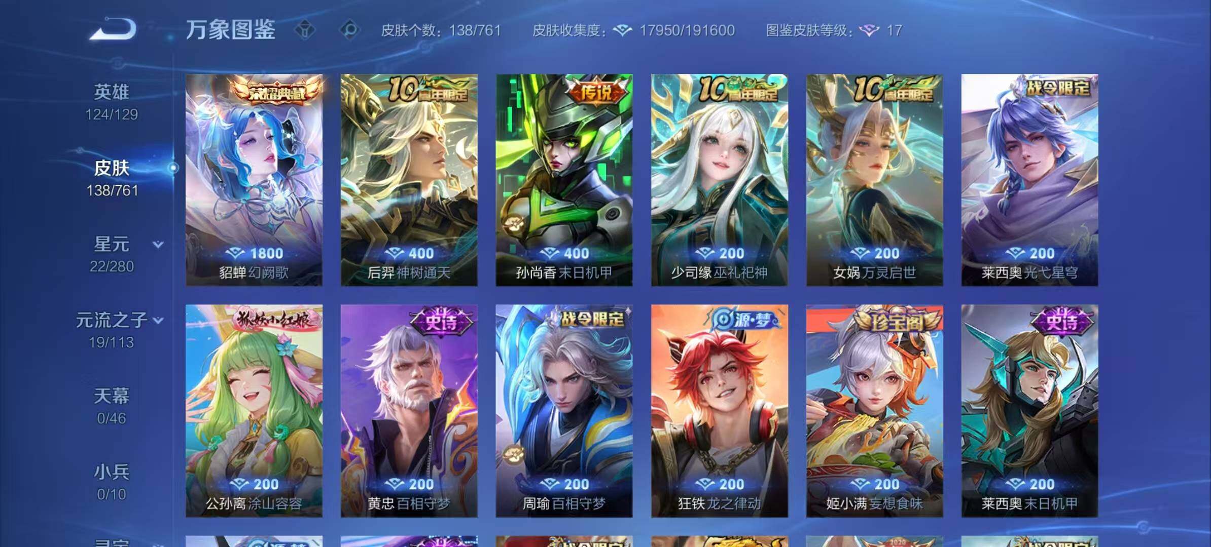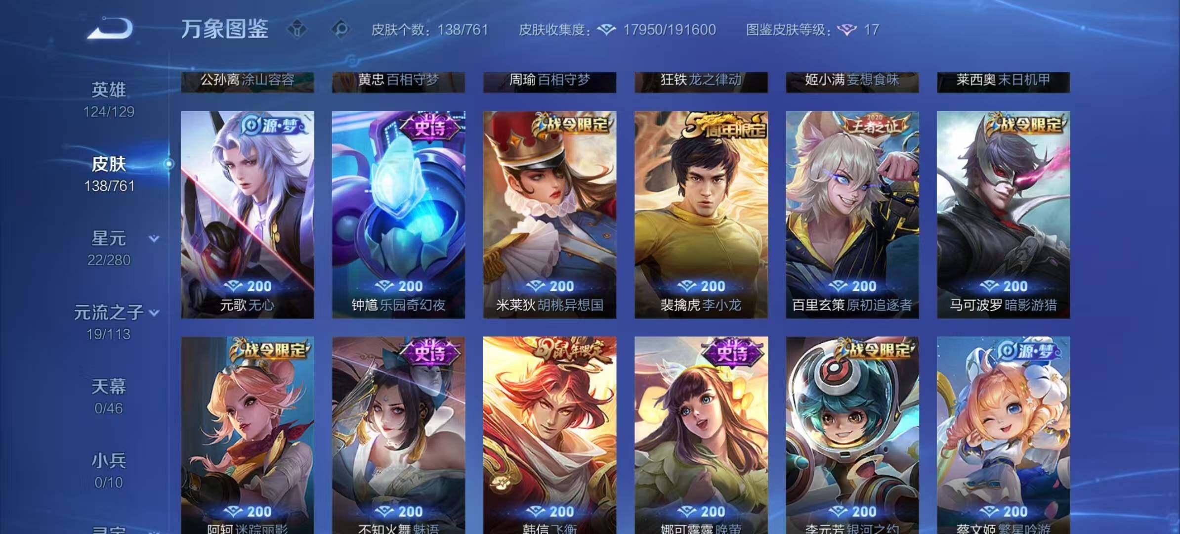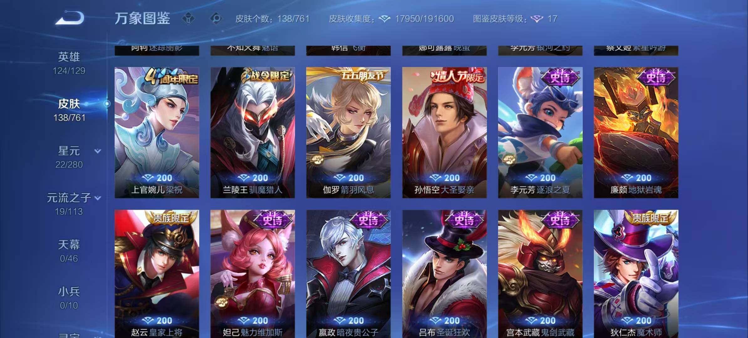 【史诗皮肤】:赵云皇家上将,王昭君偶像歌手,狄仁杰魔术师,廉颇地狱岩魂,宫本武藏鬼剑武藏,嬴政暗夜贵公子,妲己魅力维加斯,吕布圣诞狂欢,李元芳逐浪之夏,孙悟空大圣娶亲,伽罗箭羽风息,狄仁杰鹰眼统帅,兰陵王驯魔猎人,上官婉儿梁祝,蔡文姬繁星吟游,李元芳银河之约,娜可露露晚萤,韩信飞衡,不知火舞魅语,阿轲迷踪丽影,马可波罗暗影游猎,百里玄策原初追逐者,裴擒虎李小龙,米莱狄胡桃异想国,钟馗乐园奇幻夜,元歌无心,莱西奥末日机甲,姬小满妄想食味,狂铁龙之律动,周瑜百相守梦,黄忠百相守梦,公孙离涂山容容,莱西奥光弋星穹,女娲万灵启世,少司缘巫礼祀神