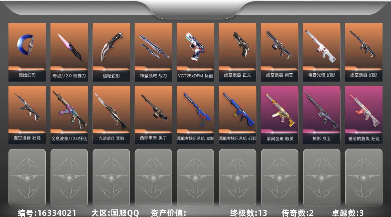 [16334021]【套装】:虚空遗器套装 【英雄】:幻棱,炼狱,维斯,暮蝶,钛狐,壹决,铁臂,捷风,雷兹,幽影,不死鸟,贤者,猎枭,蝰蛇,零,芮娜,奇乐,尚勃勒,霓虹,斯凯,夜露,星礈,K/O,海神,盖可,黑梦,钢锁 【近战 武器】:近战武器-奇点//2.0 蝴蝶刀,近战武器-源始幻刃,近战武器-诡秘蛇影 军刀,近战武器-神圣领域 战刀 【狂徒】:狂徒-全息波普//2.0,狂徒-虚空遗器,狂徒-盖亚的复仇,狂徒-诡秘蛇影 【幻影】:幻影-源能者娱乐系统,幻影-虚空遗器,幻影-电音光谱,幻影-神圣领域,幻影-末日之翼,幻影-电音光谱 【戍卫】:戍卫-掠影,戍卫-月球哨兵,戍卫-折光棱晶 【獠犬】:獠犬-神圣领域 【冥驹】:冥驹-光明哨兵,冥驹-星云暗涌 【飞将】:飞将-末日之翼 【莽侠】:莽侠-诡秘蛇影,莽侠-月球哨兵 【战神】:战神-神圣领域 【奥丁】:奥丁-西部未来,奥丁-末日之翼 【判官】:判官-虚空遗器,判官-诡秘蛇影 【雄鹿】:雄鹿-月球哨兵 【骇灵】:骇灵-紫阙金琅,骇灵-无限竞技,骇灵-星云暗涌 【蜂刺】:蜂刺-星云暗涌,蜂刺-折光棱晶 【标配】:标配-折光棱晶 【VCT手枪】:标配-VCT25 x DFM 【正义】:正义-虚空遗器,正义-月球哨兵 【鬼魅】:鬼魅-源能者娱乐系统,鬼魅-诡秘蛇影,鬼魅-星云暗涌 【狂怒】:狂怒-神圣领域 【短炮】:短炮-末日之翼 【卡面】:精灵大战 卡面,南瓜盛典 卡面,热舞环节 卡面,Clutch 卡面,无畏契约GO!第一卷:芮娜 卡面,无畏契约GO!第一卷:零 卡面,《双城之战》金克丝 卡面,无畏契约GO!第一卷:贤者 卡面,别冒尖 卡面,代号红色 卡面,新兵报到 卡面,V契约 卡面,无畏契约 卡面 【喷漆】:嗨宝南瓜灯 喷漆,控场勿近 喷漆,买装还是存钱 喷漆,无畏契约GO!第一卷:芮娜 喷漆,无畏契约GO!第一卷:贤者 喷漆,暴走萝莉 喷漆,胜利属于无畏契约 喷漆,GLHF 喷漆,无畏契约 喷漆 【挂饰】:伞绳 挂饰,第九季//第三幕 纪念币 挂饰,天外飞客 挂饰,《双城之战》魄罗 挂饰,无畏契约 纪念币 挂饰