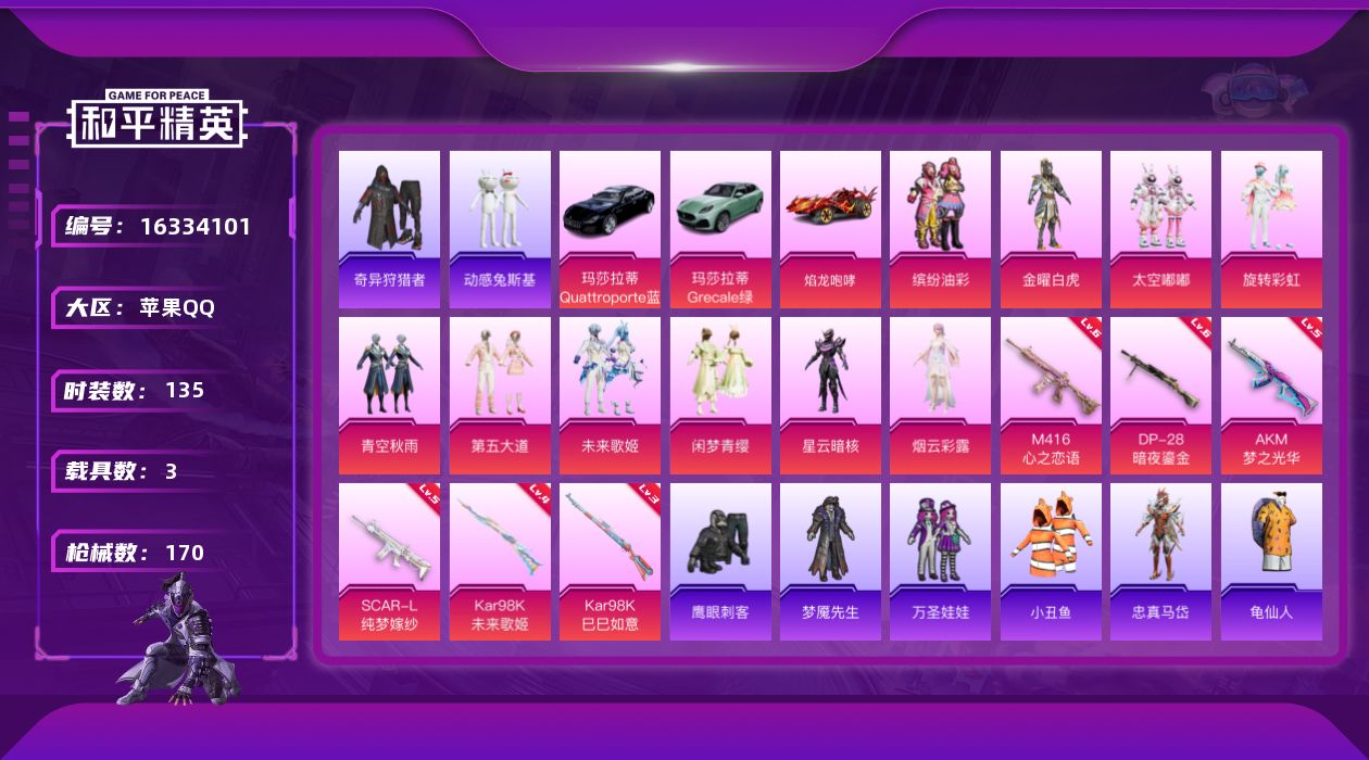 [16334101]【店主推荐捡漏号!可直接换绑】苹果 手Q-10粉装-6特效枪-3载具-3粉色飞行器-63735热力值-10王牌印记-135套装-170枪皮【热门品类】:粉装-缤纷油彩,套装-小丑鱼,套装-奇异狩猎者,套装-动感兔斯基人偶服,角色-忠真马岱,套装-龟仙人,套装-粉红小猪,套装-红红火火【粉色套装】:粉装-金曜白虎,粉装-缤纷油彩,粉装-太空嘟嘟,粉装-旋转彩虹,粉装-青空秋雨,粉装-第五大道,粉装-未来歌姬,粉装-闲梦青缨,角色-星云暗核,角色-烟云彩露【粉色枪皮等级】:AKM-梦之光华(五级),SCAR-L-纯梦嫁纱(五级),M416-心之恋语(六级),Kar98K-未来歌姬(四级),Kar98K-巳巳如意(三级),DP-28-暗夜鎏金(六级)【粉色载具】:玛莎拉蒂Quattroporte(夜幕蓝),玛莎拉蒂Grecale(薄荷绿),焰龙咆哮【粉色枪皮】:AKM-梦之光华,SCAR-L-纯梦嫁纱,M416-心之恋语,Kar98K-未来歌姬,Kar98K-巳巳如意,DP-28-暗夜鎏金【粉色飞行器】:千面幻镜飞行器,粉樱探戈飞行器,镜光幻境飞行翼