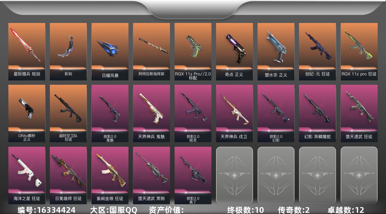 [16334424]【套装】:掠影//2.0套装 【英雄】:幻棱,炼狱,维斯,暮蝶,钛狐,壹决,铁臂,捷风,雷兹,幽影,不死鸟,贤者,猎枭,蝰蛇,零,芮娜,奇乐,尚勃勒,霓虹,斯凯,夜露,星礈,K/O,盖可,黑梦,钢锁 【近战武器】:近战武器-影钩,近战武器-日耀风暴 遗器,近战武器-阿特拉斯指挥部 甩棍,近战武器-星际猎兵 短剑 【狂徒】:狂徒-超时空卫队,狂徒-创·纪元,狂徒-RGX 11z Pro,狂徒-堕天遗武,狂徒-海洋之星,狂徒-日冕雄师,狂徒-紫阙金琅 【幻影】:幻影-异鳞魔蛇,幻影-掠影//2.0 【戍卫】:戍卫-天界神兵 【冥驹】:冥驹-堕天遗武 【奥丁】:奥丁-掠影//2.0 【骇灵】:骇灵-掠影//2.0,骇灵-无限竞技 【标配】:标配-RGX 11z Pro//2.0 【正义】:正义-奇点,正义-塑水宗,正义-ORA x 颗秒 【鬼魅】:鬼魅-天界神兵,鬼魅-掠影//2.0 【卡面】:无畏契约:暮蝶 卡面,树懒大作战 卡面,无畏契约GO!第一卷:芮娜 卡面,无畏契约GO!第一卷:零 卡面,无垠星环 卡面,代号红色 卡面,冰淇淋店 卡面,新兵报到 卡面,V契约 卡面,无畏契约 卡面 【喷漆】:伤心心 喷漆,买装还是存钱 喷漆,无畏契约GO!第一卷:贤者 喷漆,胜利属于无畏契约 喷漆,GLHF 喷漆,无畏契约 喷漆 【挂饰】:薰衣草之心 挂饰,天外飞客 挂饰,无畏契约 纪念币 挂饰