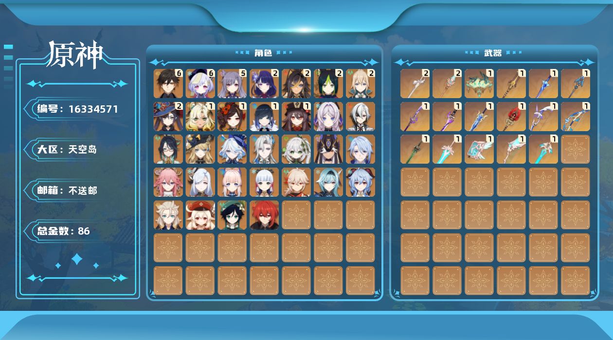 [16334571]60级/86黄/女主/34个五星角色/19个五星武器