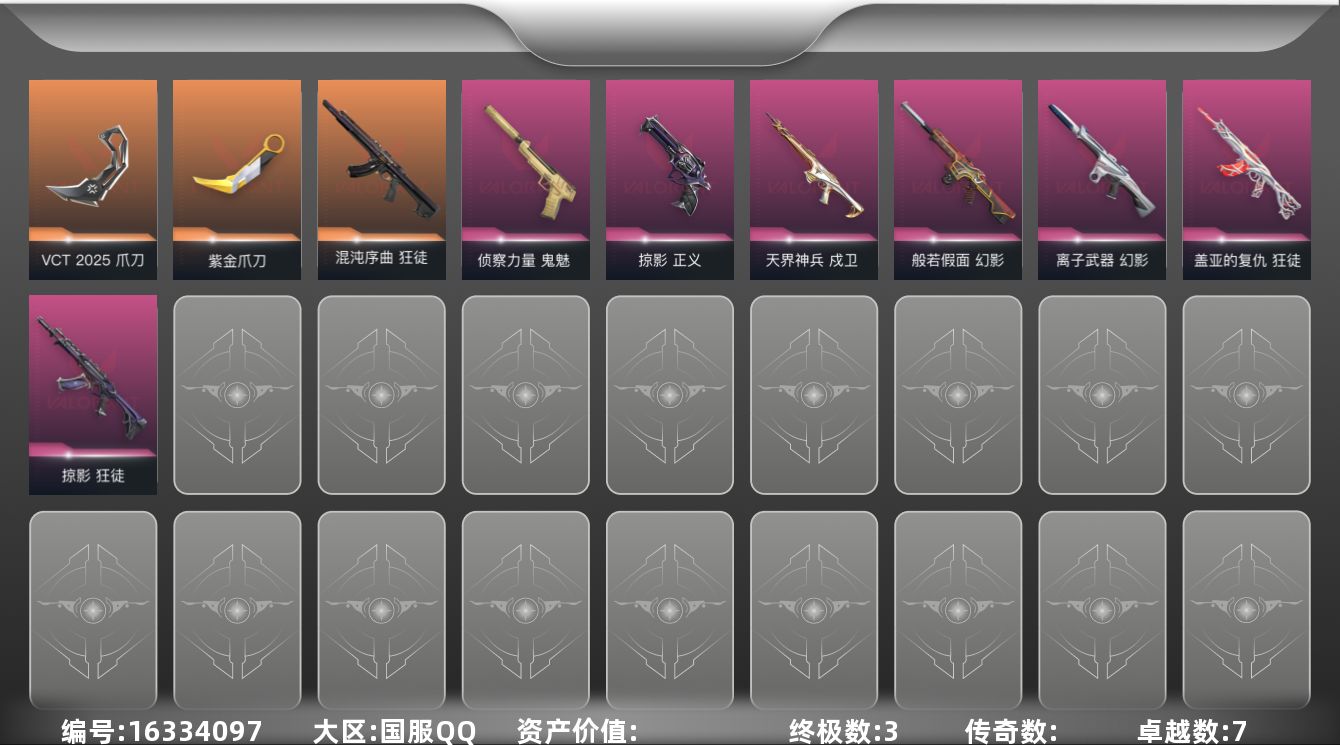 [16334097]【套装】:VCT 2025 赛季套装 【英雄】:幻棱,炼狱,维斯,暮蝶,钛狐,壹决,铁臂,捷风,雷兹,幽影,不死鸟,贤者,猎枭,蝰蛇,零,芮娜,奇乐,尚勃勒,霓虹,斯凯,夜露,星礈,K/O,海神,盖可,黑梦,钢锁 【近战 武器】:近战武器-VCT 2025 爪刀,近战武器-紫金爪刀 【狂徒】:狂徒-混沌序曲,狂徒-掠影,狂徒-盖亚的复仇 【幻影】:幻影-般若假面,幻影-离子武器 【戍卫】:戍卫-天界神兵 【标配】:标配-超能偶像 【正义】:正义-掠影,正义-超限闪存,正义-复古浪潮,正义-纳米打击 【鬼魅】:鬼魅-侦察力量,鬼魅-流星兵团,鬼魅-诡秘蛇影,鬼魅-光导纤维,鬼魅-星云暗涌 【短炮】:短炮-蛇吻 【卡面】:终章:激斗汉堡 卡面,进入射程 卡面,《双城之战》拥抱 卡面,精灵大战 卡面,欢迎来到底城 卡面,南瓜盛典 卡面,VCT CN首冠 卡面,修车达人 卡面,热舞环节 卡面,正义的化身 卡面,至黑之夜 卡面,终章:生意人麦宝 卡面,铁之华 卡面,时间到 卡面,最高舞台 卡面,音熊登场 卡面,树懒大作战 卡面,声感陷阱设计图 卡面,红鳞松叶 卡面,梦幻奶茶 卡面,终章:打造专属狂徒 卡面,趁热吃 卡面,源能反应 卡面,零点嗅探设计图 卡面,终章:瓦娃脸雪糕 卡面,无畏契约:蝰蛇 卡面,表象之下 卡面,沙雕爆能器 卡面,无畏契约GO!第一卷:芮娜 卡面,清除名单 卡面,无畏契约GO!第一卷:零 卡面,终章:同步耍酷 卡面,龍记 卡面,化茧成蝶 卡面,无垠星环 卡面,《双城之战》金克丝 卡面,完美调谐 卡面 ,暗枪 卡面,无畏契约GO!第一卷:贤者 卡面,铁臂设计图 卡面,代号红色 卡面,新兵报到 卡面,V契约 卡面,无畏契约 卡面 【喷漆】:嗨宝南瓜灯 喷漆,嘭! 喷漆,都算到了 喷漆,控场勿近 喷漆,小丑猫 喷漆,熊抱 喷漆,蛋糕还是爆能器? 喷漆,超级粉丝 喷漆,捷风差距 喷漆,惊声尖叫 喷漆,战术熊的巴拉莱卡琴 喷漆,审判之爪 喷漆,拼一枪 喷漆,我觉得不行 喷漆,蝰蛇 喷漆,我的刀呢? 喷漆,致命毒素 喷漆,喜欢哪种毒? 喷漆,霓光四射 喷漆,UWU 喷漆,新潮流 喷漆,双击点赞 喷漆,买装还是存钱 喷漆,醒狮贺春 喷漆,关门放狗 喷漆,酷熊冲浪 喷漆,无畏契约GO!第一卷:芮娜 喷漆,红鳞 喷漆,无畏契约GO!第一卷:零 喷漆,无畏契约GO!第一卷