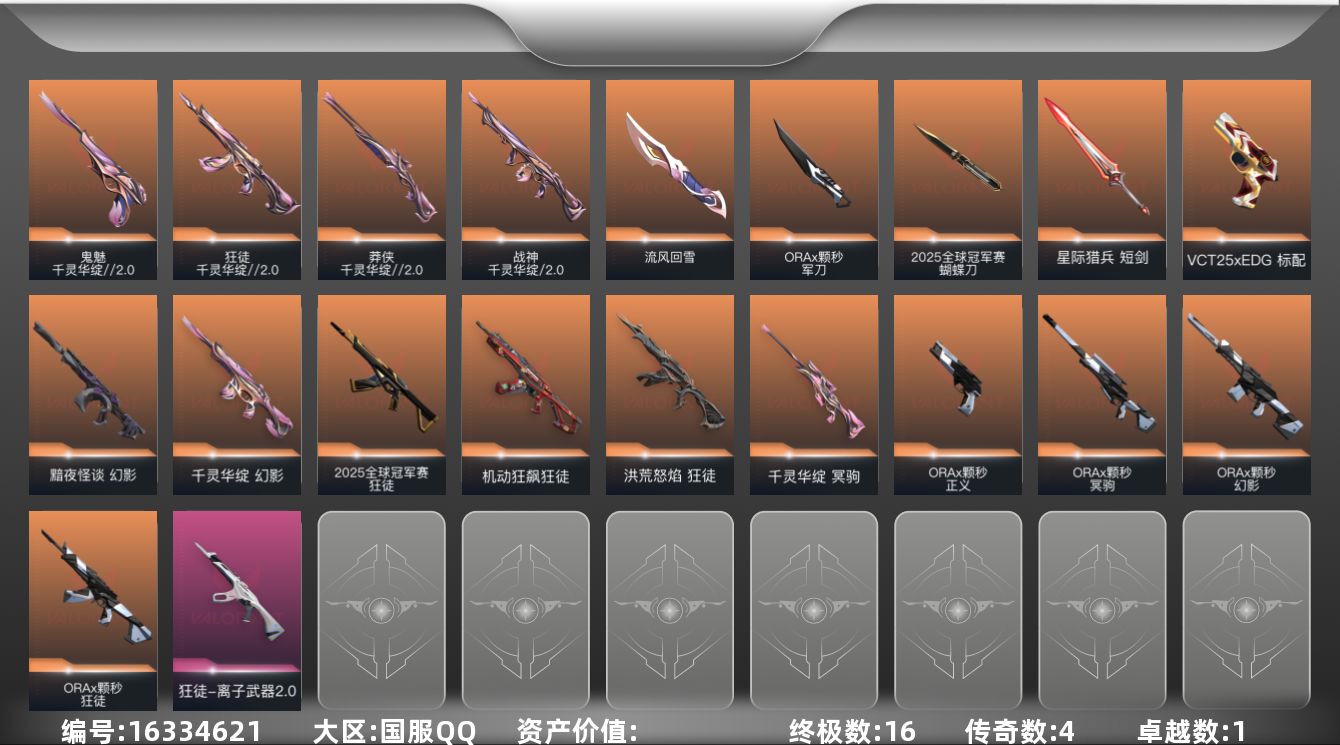 [16334621]【套装】:2025全球冠军赛套装,千灵华绽//2.0套装,ORA x 颗秒套装 【英雄】:炼狱,暮蝶,壹决,铁臂,捷风,雷兹,不死鸟,贤者,猎枭,芮娜,尚勃勒,霓虹,斯凯,夜露,K/O,盖可,黑梦,钢锁 【近战武器】:近战武器-2025全球冠军赛 蝴蝶刀,近战武器-流风回雪,近战武器-ORA x 颗秒 军刀,近战武器-星际猎兵 短剑 【狂徒】:狂徒-2025全球冠军赛,狂徒-洪荒怒焰,狂徒-机动狂飙,狂徒-ORA x 颗秒,狂徒-千灵华绽//2.0,狂徒-离子武器//2.0 【幻影】:幻影-黯夜怪谈,幻影-千灵华绽,幻影-ORA x 颗秒 【冥驹】:冥驹-千灵华绽,冥驹-ORA x 颗秒 【莽侠】:莽侠-千灵华绽//2.0 【战神】:战神-千灵华绽//2.0 【VCT手枪】:标配-VCT25 x EDG 【正义】:正义-ORA x 颗秒 【鬼魅】:鬼魅-千灵华绽//2.0 【卡面】:无畏契约GO!第一卷:芮娜 卡面,无畏契约GO!第一卷:零 卡面,别冒尖 卡面,代号红色 卡面,新兵报到 卡面,V契约 卡面,无畏契约 卡面 【喷漆】:买装还是存钱 喷漆,红鳞 喷漆,暴走萝莉 喷漆,松叶 喷漆,胜利属于无畏契约 喷漆,GLHF 喷漆,无畏契约 喷漆 【挂饰】:VCT x EDG 挂饰,天外飞客 挂饰,无畏契约 纪念币 挂饰
