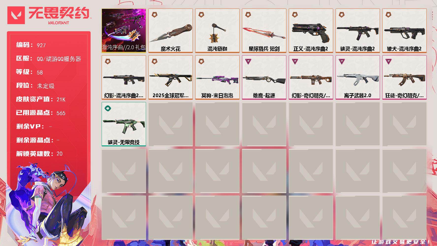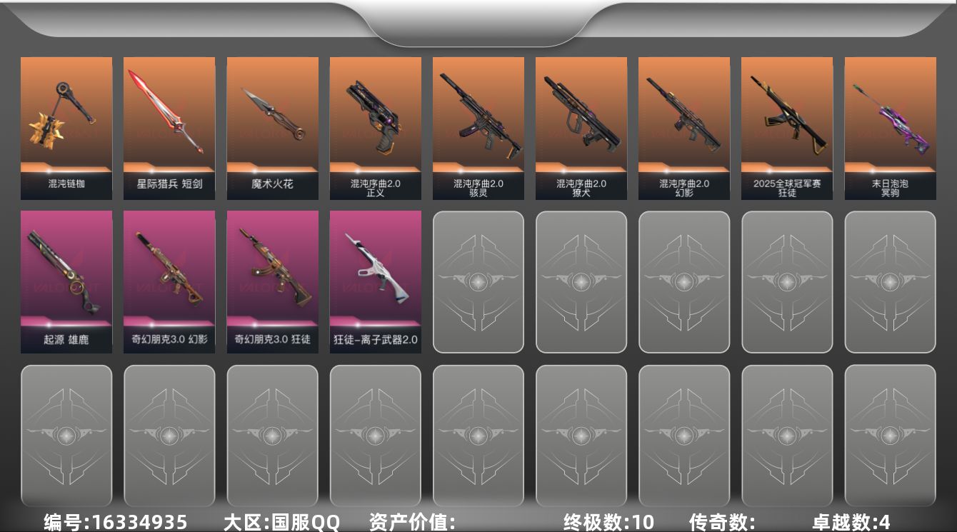 [16334935]【套装】:混沌序曲//2.0套装 【英雄】:幻棱,炼狱,暮蝶,壹决,铁臂,捷风,雷兹,幽影,不死鸟,贤者,猎枭,零,芮娜,尚勃勒,霓虹,夜露,海神,盖可,钢锁 【近战武器】:近战武器-混沌链枷,近战武器-魔术火花,近战武器-星际猎兵 短剑,近战武器-魔术火花 【狂徒】:狂徒-2025全球冠军赛,狂徒-离子武器//2.0,狂徒-奇幻朋克//3.0 【幻影】:幻影-混沌序曲//2.0,幻影-奇幻朋克//3.0 【獠犬】:獠犬-混沌序曲//2.0 【冥驹】:冥驹-末日泡泡 【雄鹿】:雄鹿-起源 【骇灵】:骇灵-混沌序曲//2.0,骇灵-无限竞技 【正义】:正义-混沌序曲//2.0 【卡面】:红鳞松叶 卡面,钢锁vs盖可 卡面,代号红色 卡面,新兵报到 卡面,V契约 卡面,无畏契约 卡面 【喷漆】:关门放狗 喷漆,胜利属于无畏契约 喷漆,GLHF 喷漆,无畏契约 喷漆 【挂饰】:无畏契约GO!第一卷 零 挂饰,《双城之战》魄罗 挂饰,无畏契约 纪念币 挂饰