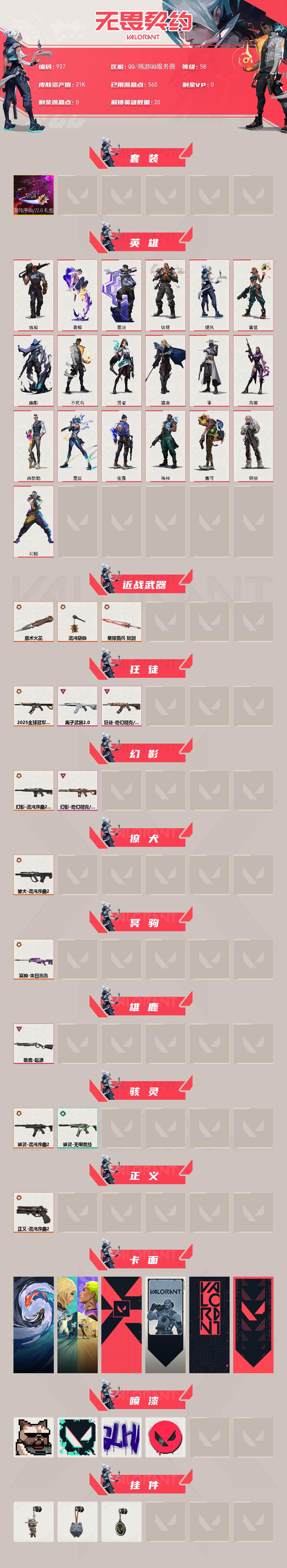 - [16334112]【英雄】:幻棱,炼狱,捷风,不死鸟,贤者,猎枭,黑梦 【狂徒】:狂徒-光荣异象 【卡面】:别冒尖 卡面,代号红色 卡面,新兵报到 卡面,V契约 卡面,无畏契约 卡面 【喷漆】:无畏契约GO!第一卷:贤者 喷漆,暴走萝莉 喷漆,胜利属于无畏契约 喷漆,GLHF 喷漆,无畏契约 喷漆 【挂饰】:《双城之战》魄罗 挂饰,无畏契约 纪念币 挂饰
