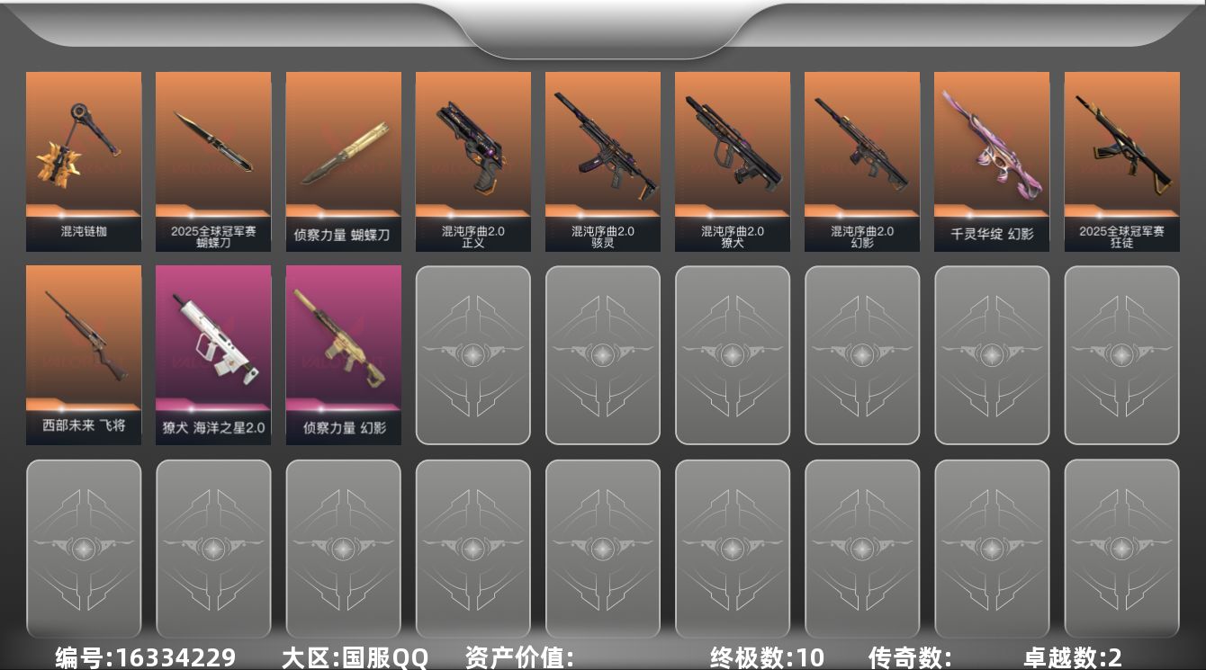 [16334229]【套装】:2025全球冠军赛套装,混沌序曲//2.0套装 【英雄】:炼狱,暮蝶,捷风,不死鸟,贤者,猎枭,零,芮娜,奇乐,尚勃勒,霓虹,K/O,钢锁 【近战 武器】:近战武器-2025全球冠军赛 蝴蝶刀,近战武器-混沌链枷,近战武器-侦察力量 蝴蝶刀 【狂徒】:狂徒-2025全球冠军赛 【幻影】:幻影-千灵华绽,幻影-混沌序曲//2.0,幻影-侦察力量 【獠犬】:獠犬-混沌序曲//2.0,獠犬-海洋之星//2.0 【飞将】:飞将-西部未来 【骇灵】:骇灵-混沌序曲//2.0 【正义】:正义-混沌序曲//2.0 【卡面】:无畏契约GO!第一卷:零 卡面,代号红色 卡面,新兵报到 卡面,V契约 卡面,无畏契约 卡面 【喷漆】:买装还是存钱 喷漆,胜利属于无畏契约 喷漆,GLHF 喷漆,无畏契约 喷漆 【挂饰】:无畏契约 纪念币 挂饰