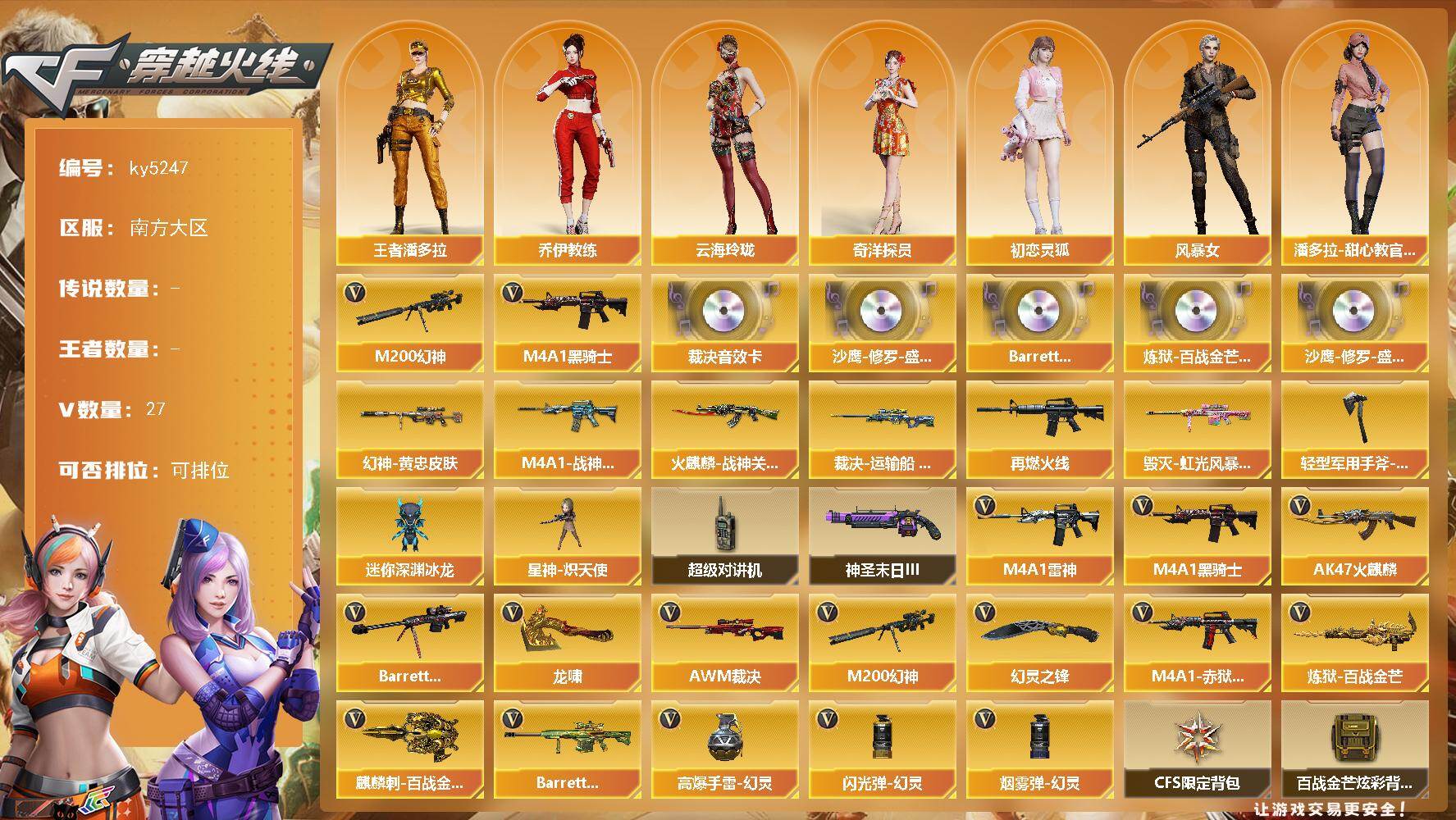 [16334955]南方大区-28V-0王者武器数-0炫金武器数 【传说角色】:传说星骇 【热门武器】:M200-幻神,M4A1-黑骑士 【音效卡】:AWM-裁决音效卡,沙鹰-修罗-盛典舞曲音效卡*2,Barrett-碧霄极光音效卡,炼狱-百战金芒-庆典舞曲音效卡 【皮肤】:M200-幻神-黄忠皮肤,裁决-运输船 皮肤,M4A1-战神赵云,M4A1-再燃火线,火麒麟-战神关羽,毁灭-虹光风暴 皮肤,轻型军用手斧-再燃火线 【角色】:王者潘多拉,奇洋探员,乔伊教练,云海玲珑,初恋灵狐,风暴女,潘多拉-甜心教官,斯沃特-X,兔囡囡 【人偶武器】:星神-炽天使,迷你深渊冰龙 【暴走生化】:超级对讲机 【挑战大师】:神圣爆裂者-末日III 【英雄级武器】:AK47-火麒麟,M4A1-雷神,M4A1-黑骑士,Barrett-毁灭,AWM-裁决,M200-幻神,炼狱-百战金芒,龙啸,幻灵之锋*2,麒麟刺-百战金芒,高爆手雷-幻灵*2,闪光弹-幻灵*5,烟雾弹-幻灵*3,M4A1-赤狱骑士,Barrett-碧霄极光 【道具】:CFS限定背包,百战金芒炫彩背包,女皇终结者-魔龙之吻,绿色巨人,灵魂忍者,变异宝贝,迷雾幽灵,夺命之镰,防化服*3,金色流光-枪王排位*2,流光-再燃火线,枪王排位28赛季金色流光,枪王排位29赛季金色流光,语音特效-盛典烟火,萌萌小葵表情,电玩兔兔表情,炽雪表情,EP战队名片,防弹头盔*4,防弹衣*4,C4工具钳*4,手雷包*4 【特殊枪械】:1黑骑士