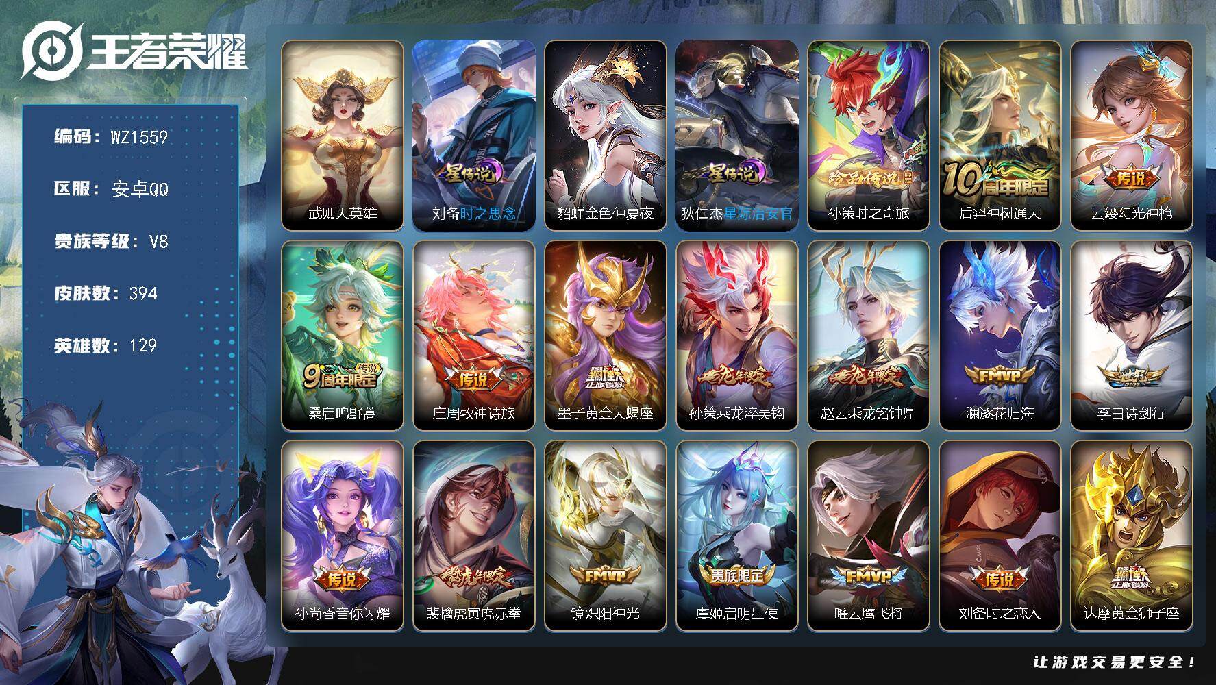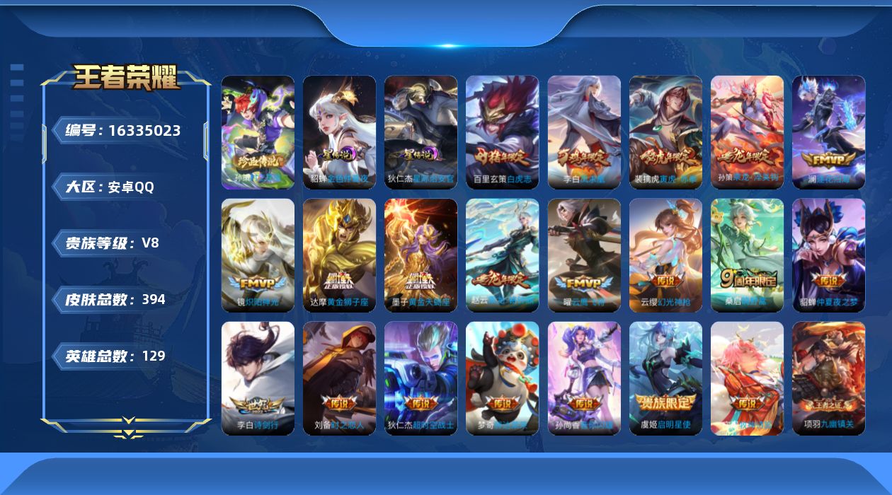 [16335023]安卓Q-V8-至尊星耀II段位-129英雄-394皮肤-1典藏英雄-1珍品传说-21传说-109史诗