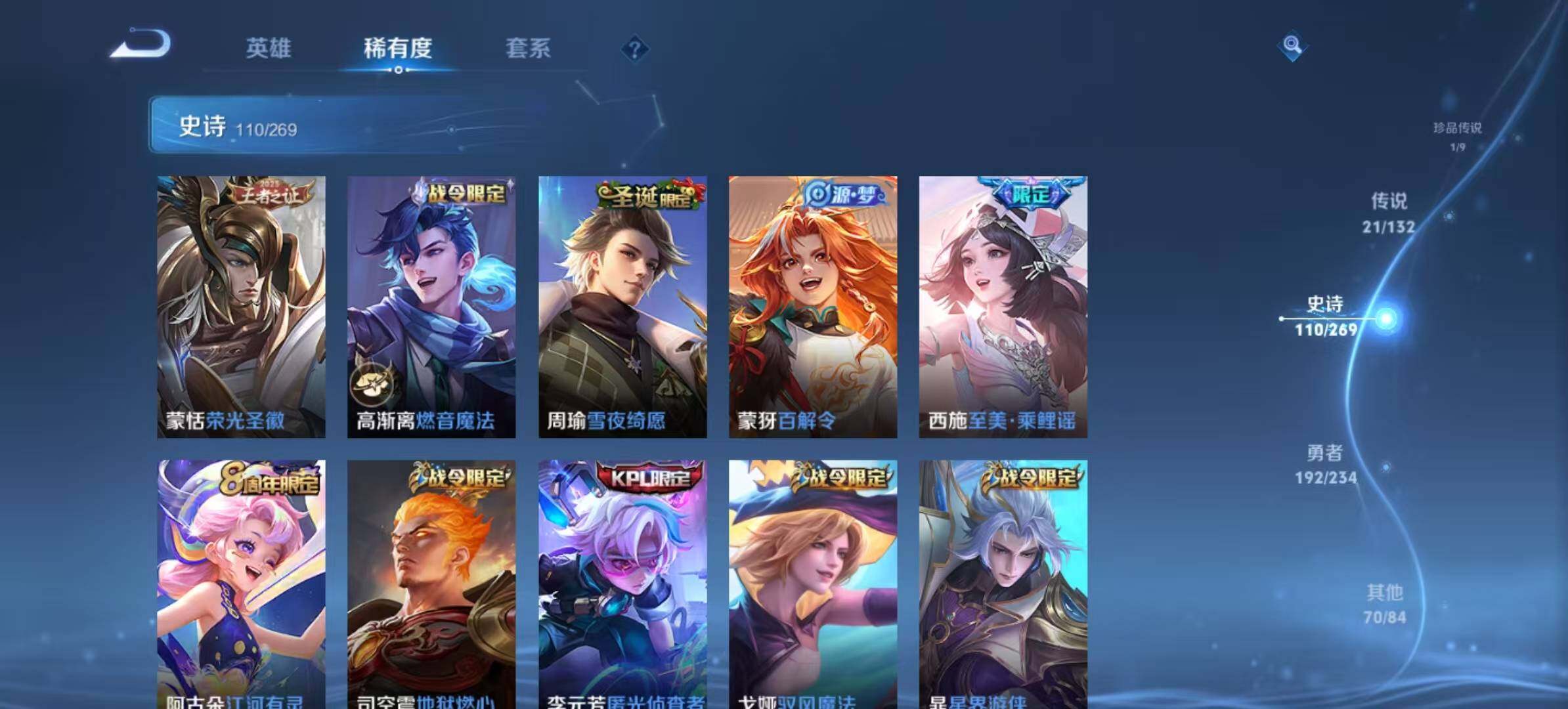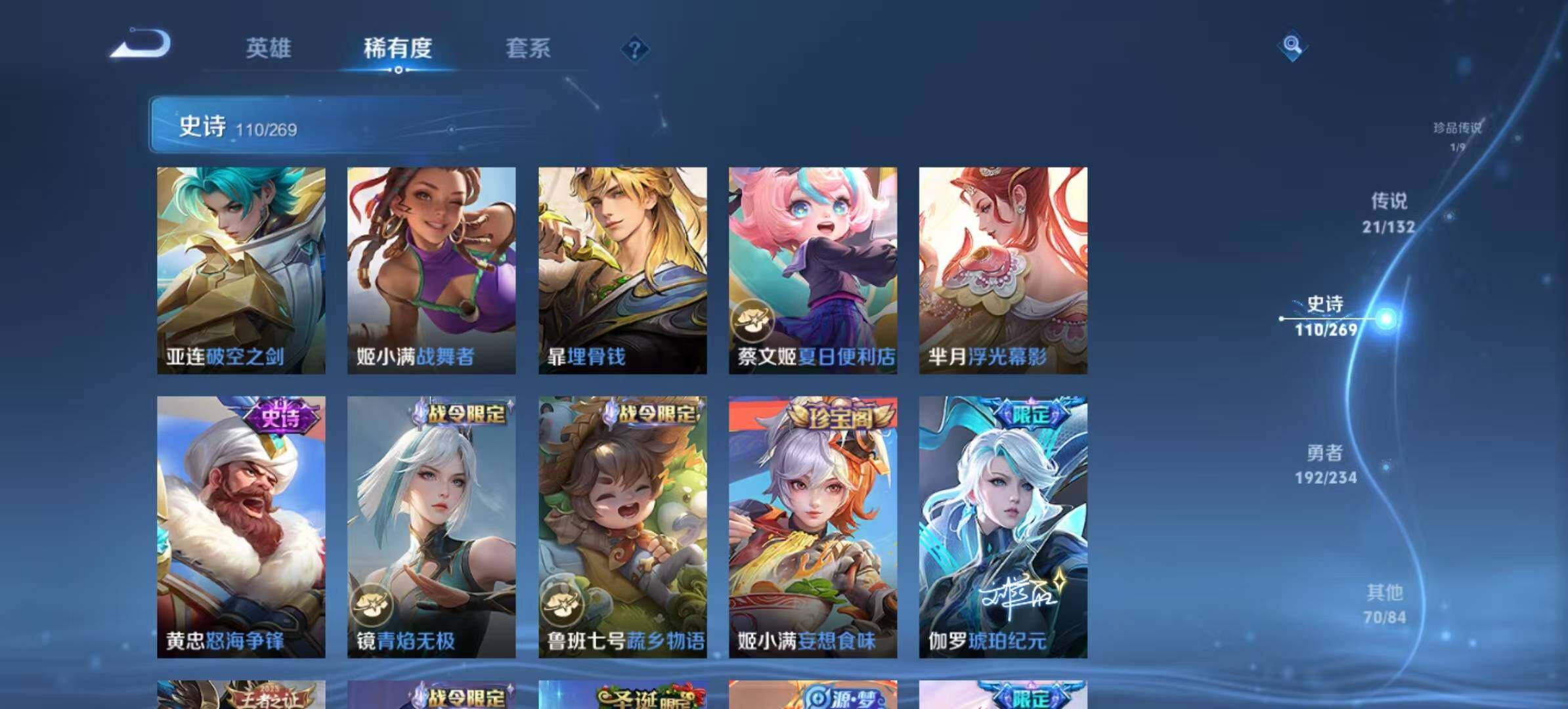【限定皮肤】:白起狰,暃埋骨钱,蔡文姬夏日便利店,大乔绒语心约,虞姬夏日便利店,姜子牙天穹之誓,杨戬破阵退雄兵,李白谪仙醉月,狄仁杰阴阳师,虞姬凯尔特女王,赵云皇家上将,赵云百木心枪,墨子神迹守卫,嬴政白昼王子,鲁班七号狮舞东方,庄周蜃楼王,高渐离死亡摇滚,高渐离玩趣恶龙,阿轲迷踪丽影,钟无艳超时空战士,孙膑妖精王,扁鹊炼金王,芈月重明,吕布猎兽之王,周瑜赤莲之焰,元歌云间偶戏,元歌无心,夏侯惇朔风刀,曹操烛龙,曹操天狼征服者,典韦穷奇,典韦蓝屏警告,马可波罗暗影游猎,狄仁杰魔术师,狄仁杰万华元夜,达摩沙漠行僧,项羽海滩派对,老夫子醍醐杖,老夫子航海奇遇记,程咬金演武夺筹,刘邦夺宝奇兵,韩信飞衡,兰陵王驯魔猎人,兰陵王金庭之子,亚瑟狮心王,亚瑟潮玩骑士王,孙悟空至尊宝,牛魔御旌,李元芳银河之约,李元芳匿光侦查者,李元芳云中旅人,虞姬启明星使,钟馗神迹守卫,钟馗驱傩正仪,杨玉环遇见飞天,女娲朔望之晖,雅典娜单词大作战,雅典娜黎明之约,蔡文姬繁星吟游,太乙真人饕餮,太乙真人华丽摇滚,鬼谷子原初探秘者,苏烈千军破阵,百里玄策白虎志,百里玄策原初追逐者,弈星混沌棋,梦奇顽趣,沈梦溪星空之诺,沈梦溪大漠名商,明世隐疑决卦,裴擒虎李小龙,裴擒虎寅虎赤拳,裴擒虎擒涛扼浪,狂铁御狮,米莱狄御霄,云中君纤云弄巧,猪八戒西部大镖客,上官婉儿梁祝,上官婉儿神器万象笔,嫦娥拒霜思,西施玲珑珍味,西施至美乘鲤谣,蒙犽狂想玩偶喵,鲁班大师探海日志,镜匿光追影者,暃星界游侠,戈娅驭风魔法,艾琳流音漫舞,司空震地狱燃心,阿古朵江河有灵,张良古海寻踪,蒙犽百解令,蒙恬荣光圣徽,高渐离燃音魔法,妲己灵卜魔法,鬼谷子天穹祈灯,伽罗琥珀纪元,姬小满妄想食味,孙策乘