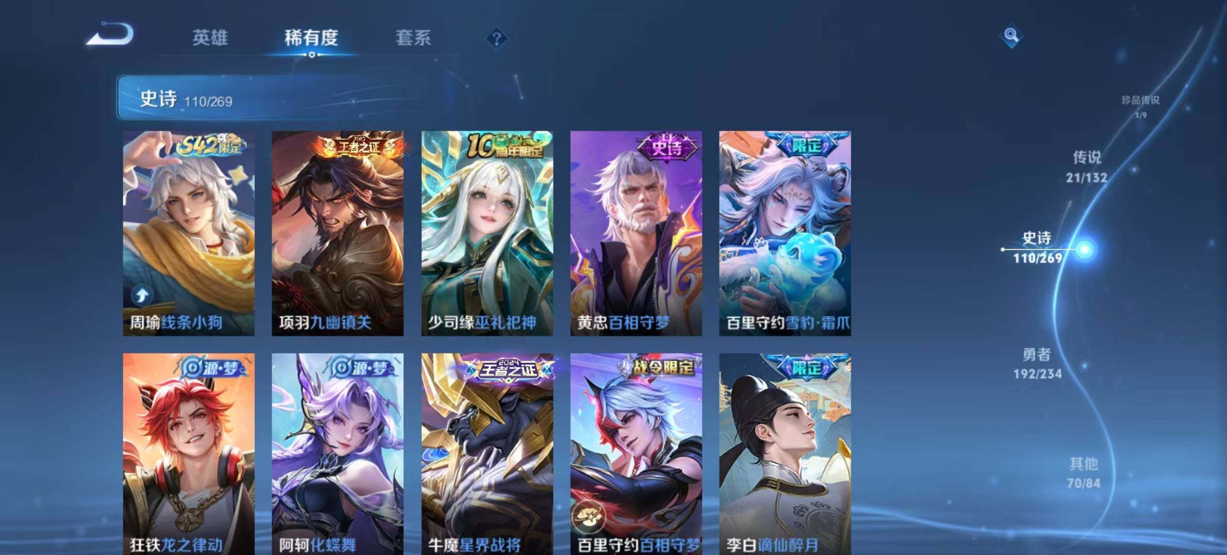 亚瑟狮心王,庄周蜃楼王,孙膑妖精王,扁鹊炼金王,虞姬凯尔特女王,白起狰,太乙真人饕餮,曹操烛龙,芈月重明,典韦穷奇,狂铁御狮,米莱狄御霄,牛魔御旌,夏侯惇朔风刀,明世隐疑决卦,老夫子醍醐杖,鬼谷子原初探秘者,狄仁杰万华元夜,程咬金演武夺筹,钟馗驱傩正仪,苏烈千军破阵,吕布猎兽之王,嬴政白昼王子,女娲朔望之晖,典韦蓝屏警告,钟馗神迹守卫,鲁班七号狮舞东方,沈梦溪星空之诺,李元芳银河之约,刘邦夺宝奇兵,马可波罗暗影游猎,蒙犽狂想玩偶喵,元歌云间偶戏,弈星混沌棋,达摩沙漠行僧,兰陵王金庭之子,沈梦溪大漠名商,李元芳云中旅人,裴擒虎擒涛扼浪,鲁班大师探海日志,张良古海寻踪,项羽苍威无极,镜青焰无极