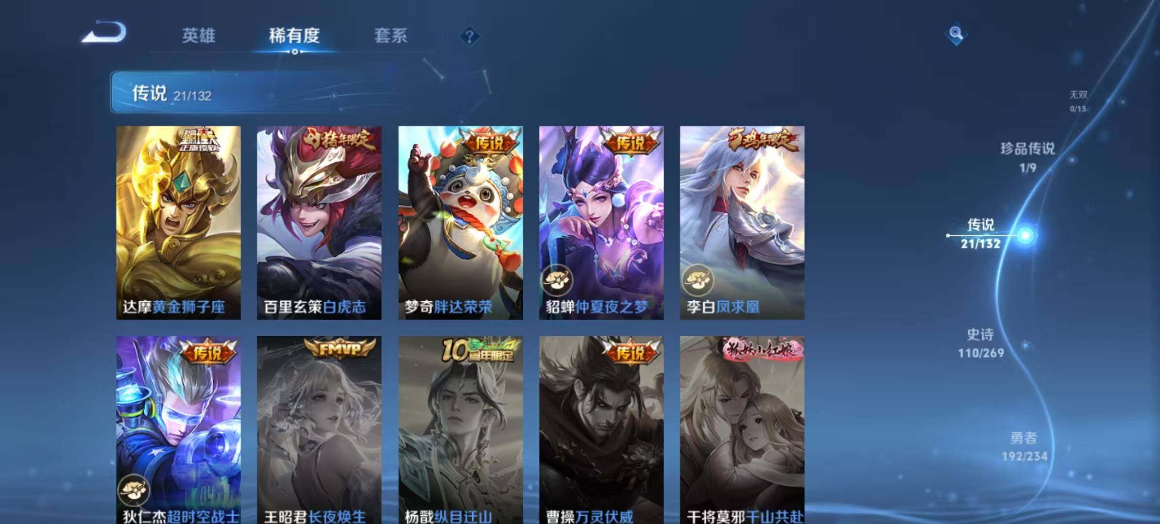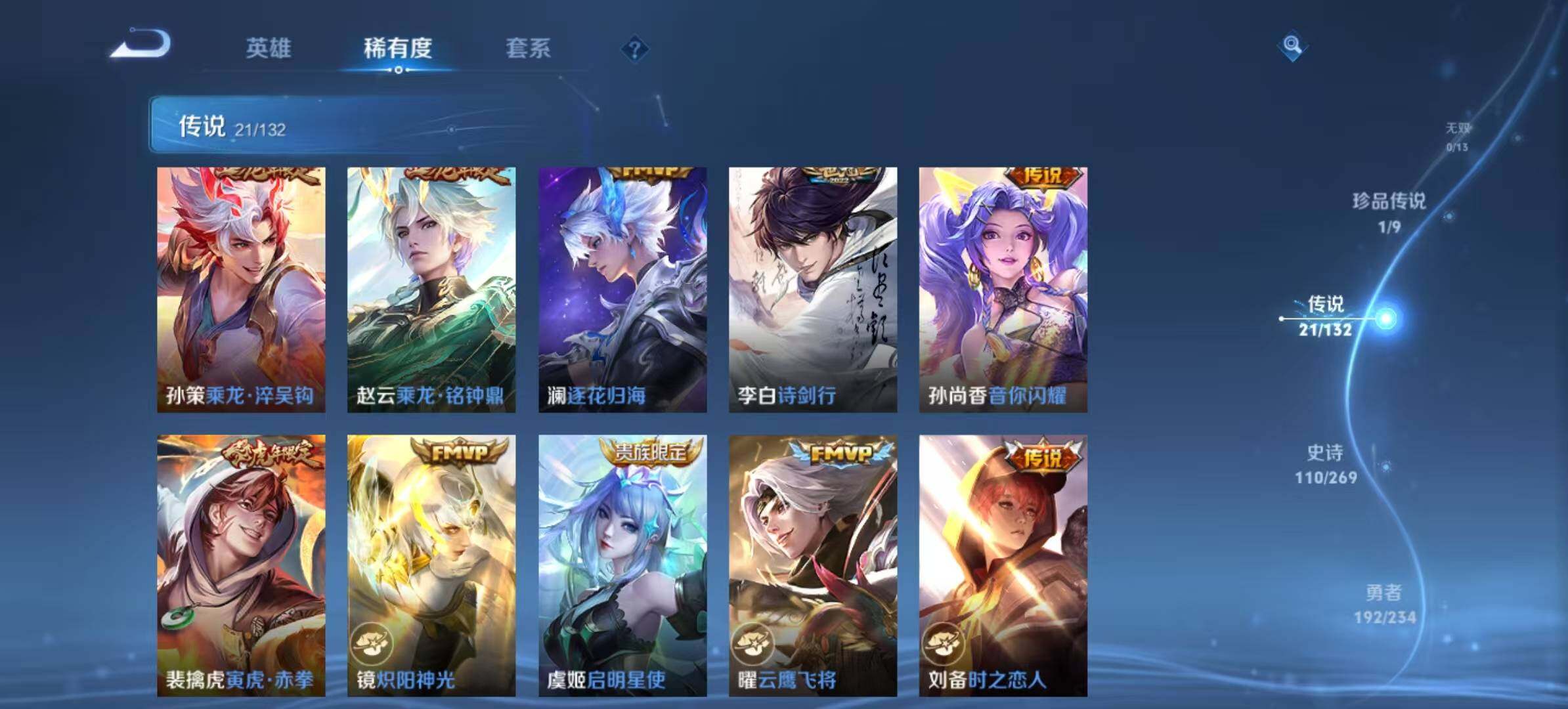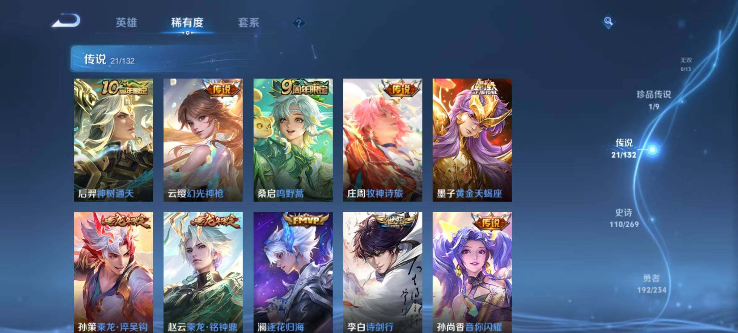 【传说皮肤】:后羿神树通天,云缨幻光神枪,桑启鸣野蒿,庄周牧神诗旅,墨子黄金天蝎座,孙策乘龙淬吴钩,赵云乘龙铭钟鼎,澜逐花归海,李白诗剑行,孙尚香音你闪耀,裴擒虎寅虎赤拳,镜炽阳神光,虞姬启明星使,曜云鹰飞将,刘备时之恋人,达摩黄金狮子座,百里玄策白虎志,梦奇胖达荣荣,貂蝉仲夏夜之梦,李白凤求凰,狄仁杰超时空战士