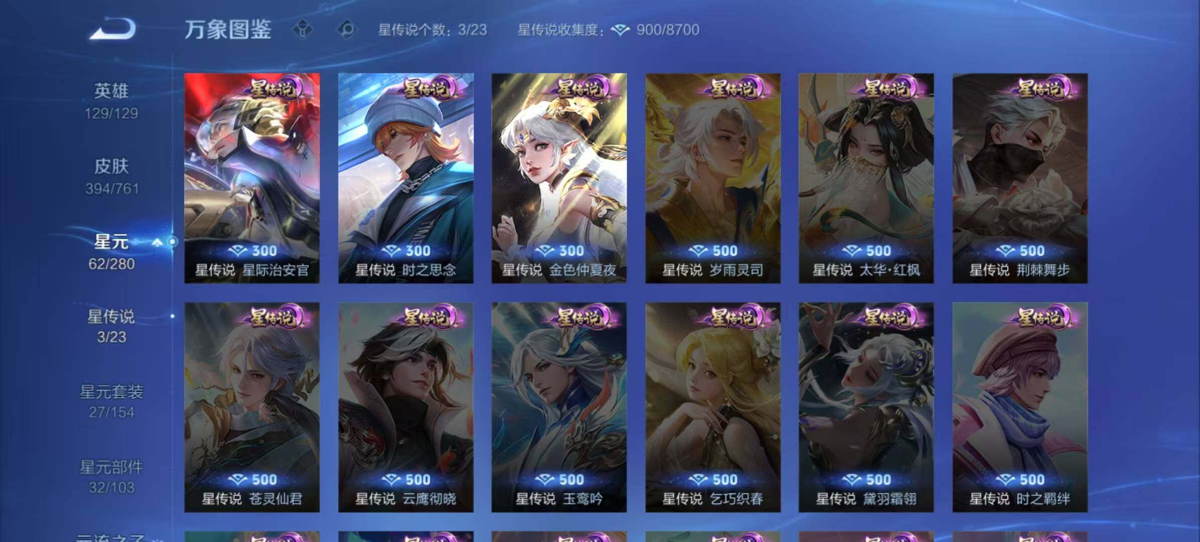 小乔青蛇,娜可露露晚萤,李元芳逐浪之夏,不知火舞魅语,公孙离无限星赏官,大乔猫狗日记,孙策猫狗日记,阿轲节奏热浪,露娜紫霞仙子,诸葛亮黄金分割率,项羽苍穹之光,阿轲暗夜猫娘,雅典娜冰冠公主,吕布末日机甲,鲁班七号电玩小子,橘右京修罗,墨子龙骑士,嬴政摇滚巨星,刘禅绅士熊喵,刘禅天才门将,白起星夜王子,安琪拉心灵骇客,程咬金功夫厨神,刘邦德古拉伯爵,兰陵王暗隐猎兽者,曹操幽灵船长,宫本武藏鬼剑武藏,司马懿暗渊魔法,亚瑟心灵战警,蔡文姬舞动绿茵,廉颇地狱岩魂,小乔缤纷独角兽,夏侯惇乘风破浪,花木兰水晶猎龙者,铠曙光守护者,墨子金属风暴,百里玄策原初追逐者,吕布圣诞狂欢,貂蝉圣诞恋歌,百里守约特工魅影,嬴政暗夜贵公子,嫦娥拒霜思,雅典娜黎明之约,李白千年之狐,哪吒雪上飞焰,夏洛特永昼,艾琳奇遇舞章,李元芳匿光侦查者,蒙犽百解令,周瑜雪夜绮愿,高渐离燃音魔法,伽罗琥珀纪元,李白谪仙醉月