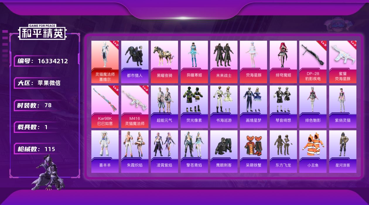[16334212]【特价出售/店主推荐】苹果 微信-1神装-4粉装-4特效枪-1载具-2粉色飞行器-34569热力值-4王牌印记-78套装-115枪皮 【红色神装等级】:灵猫魔法师-塞维尔(二级) 【红色角色神装】:灵猫魔法师-塞维尔 【热门品类】:套装-都市猎人,套装-小丑鱼,套装-星河浪客 【粉色套装】:粉装-未来战士,角色-荧海星豚,角色-绯穹魔姬,角色-异瞳寒姬 【粉色枪皮等级】:M416-灵猫魔法师(三级),蜜獾-荧海星豚(五级),Kar98K-巳巳如意(五级),DP-28-豹影疾电(五级) 【粉色载具】:黑曜夜骑 【粉色枪皮】:M416-灵猫魔法师,蜜獾-荧海星豚,Kar98K-巳巳如意,DP-28-豹影疾电 【粉色飞行器】:灵猫魔法师飞行器 【粉色降落伞】:绝对恒星降落伞,未来战士降落伞,冷漠罗丽降落伞,荧海星豚降落伞,灵猫魔法师降落伞,绯穹魔姬降落伞,喜羊羊与灰太狼降落伞,异瞳寒姬降落伞,炫彩糖果降落伞 【稀有套装】:套装-超能元气,套装-荧光像素,套装-雪国风尚,套装-炫彩糖果,套装-燕燕于飞,套装-鱼渊荷华,套装-彩虹兔,套装-云朵鹅,套装-雪绒豹,套装-混沌火种,角色-灵公主,套装-蜜露汐语,套装-蓝海鲸歌,套装-极光猎影,角色-绛羽幽主,角色-夜瞳黯灵,套装-朱霞炽焰,套装-凌霄紫焰,套装-擎苍青焰,玩偶服-喜羊羊,角色-绯色魅影,角色-紫俏灵猫,套装-书海巡游,套装-画境星梦,套装-琴音绮想 【稀有枪皮】:AUG-冰晶雪宝,AKM-影袭,AKM-缤纷海域,AKM-灵猫魔法师,AKM-极光猎影,M16A4-幻世战舞者,SCAR-L-未来战士,SCAR-L-炫彩节奏,SCAR-L-冷漠罗丽,SCAR-L-天象三御,GROZA-影袭,GROZA-荧海星豚,AUG-绝对恒星,QBZ-魔药课室,M762-云朵鹅,蜜獾-绯穹魔姬,ACE32-钛晶裂爪,ACE32-画境星梦,ARX-凌霄紫焰,UZI-影袭,UMP45-绒宝小鹅,Vector-生命誓言,汤姆逊-环太平洋,汤姆逊-灵猫魔法师,MP5K-画境星梦,AKS-74U-极光猎影,AKS-74U-荧光像素,JS9-凌霄紫焰,Kar98K-影袭,M24-影袭,SKS-迅猛狂鲨,VSS-未来战士,Mini14-绯穹魔姬,AMR-喜羊羊与灰太狼,M200-爆裂游戏,SVD-云朵鹅,M1加兰德-画境星梦,S686-未来战士,