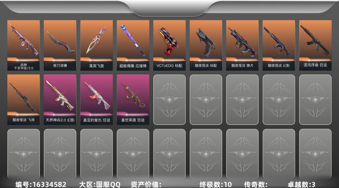 [16334582]【套装】:黯夜怪谈套装,VCTxEDG 队伍套装 【英雄】:幻棱,炼狱,维斯,暮蝶,钛狐,壹决,铁臂,捷风,雷兹,幽影,不死鸟,贤者,猎枭,蝰蛇,零,芮娜,奇乐,尚勃勒,霓虹,斯凯,夜露,星礈,K/O,海神,盖可,黑梦,钢锁 【近战武器】:近战武器-落英飞旋,近战武器-超能偶像 应援棒,近战武器-夜刃诡镰 【狂徒】:狂徒-混沌序曲,狂徒-盖世英雄,狂徒-盖亚的复仇,狂徒-超能偶像 【幻影】:幻影-黯夜怪谈,幻影-天界神兵//2.0,幻影-聚合之力 【戍卫】:戍卫-超能偶像 【獠犬】:獠犬-黯夜怪谈,獠犬-采蜜小蜂队 【飞将】:飞将-黯夜怪谈,飞将-聚合之力 【战神】:战神-千灵华绽//2.0,战神-采蜜小蜂队 【判官】:判官-超能偶像,判官-采蜜小蜂队 【蜂刺】:蜂刺-聚合之力 【标配】:标配-黯夜怪谈,标配-超能偶像 【VCT手枪】:标配-VCT x EDG 【正义】:正义-沙尘幻旅,正义-复古浪潮 【鬼魅】:鬼魅-流星兵团,鬼魅-采蜜小蜂队,鬼魅-光导纤维 【狂怒】:狂怒-聚合之力 【卡面】:欢迎来到底城 卡面,南瓜盛典 卡面,修车达人 卡面,正义的化身 卡面,终章:生意人麦宝 卡面,铁之华 卡面,失而复得 卡面,时间到 卡面,最高舞台 卡面,复活专家 卡面,归乡 // 蝰蛇 卡面,超能偶像 卡面,生意人麦宝 卡面,声感陷阱设计图 卡面,钢锁工牌 卡面,战术小伙伴的夏日 卡面,采蜜小蜂队 卡面,聚合之力 卡面,梦幻奶茶 卡面,终章:打造专属狂徒 卡面,趁热吃 卡面,源能反应 卡面,零点嗅探设计图 卡面,终章:瓦娃脸雪糕 卡面,表象之下 卡面,沙雕爆能器 卡面,无畏契约GO!第一卷:芮娜 卡面,清除名单 卡面,无畏契约GO!第一卷:零 卡面,终章:同步耍酷 卡面,龍记 卡面,化茧成蝶 卡面,《双城之战》金克丝 卡面,完美调谐 卡面 ,暗枪 卡面,终章:黑影先生的咖啡! 卡面,铁臂vs雷兹 卡面,钢锁vs盖可 卡面,别冒尖 卡面,夯实根基 卡面,"Luie" 卡面,热烈欢迎 卡面,铁臂设计图 卡面,代号红色 卡面,冰淇淋店 卡面,新兵报到 卡面,友军火力 卡面,V契约 卡面,无畏契约 卡面 【喷漆】:熊抱 喷漆,又被闪了 喷漆,终极羞辱 喷漆,超级粉丝 喷漆,黯兽卖萌 喷漆,捷风差距 喷漆,惊声尖叫 喷漆,水晶球 喷漆,2021冠军巡回赛花火 喷漆,五人成星 喷漆