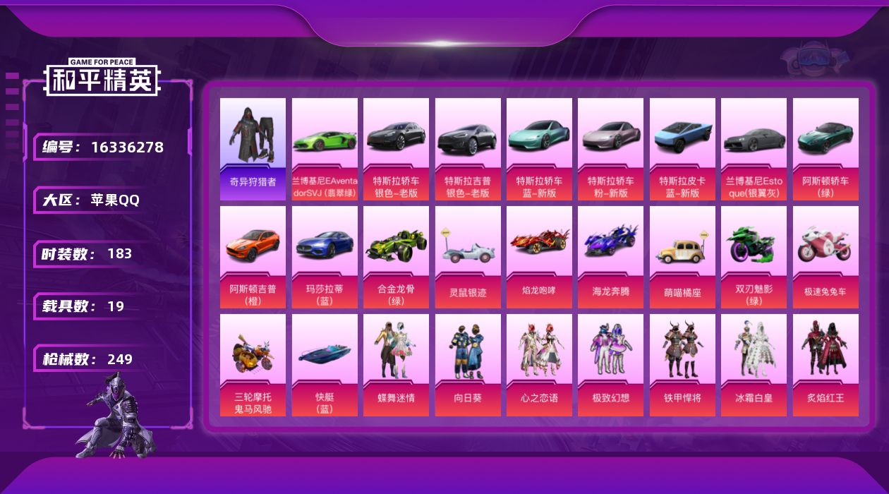 [16336278]【特价出售/店主推荐】苹果 手Q-19粉装-12特效枪-19载具-1僚机-6粉色飞行器-115763热力值-12王牌印记-183套装-249枪皮 【热门品类】:套装-奇异狩猎者,套装-黄金大亨,套装-忍者信条,套装-龟仙人 【粉色套装】:粉装-蝶舞迷情,粉装-向日葵,粉装-心之恋语,粉装-极致幻想,粉装-铁甲悍将,粉装-冰霜白皇,粉装-炙焰红王,粉装-星之彼岸,粉装-铁血龙王,粉装-暗夜玫瑰,角色-赛罗闪耀型,粉装-林间仙鹿,粉装-彩虹鹿灵,粉装-山涧鹿灵,粉装-黄伞悠悠,粉装-流星咚咚,粉装-精灵娃娃,粉装-酣梦娃娃,粉装-暗星紫秘 【粉色枪皮等级】:M416-五爪金龙(四级),M416-心之恋语(七级),GROZA-香水柠檬(七级),M762-甜心娃娃(四级),Vector-红伞翩翩(四级),汤姆逊-怪笑疯兔(四级),Kar98K-巳巳如意(五级),M24-暗星紫秘(四级),Mini14-绚金瑰梦(二级),SLR-暗夜玫瑰(三级),DP-28-豹影疾电(五级),平底锅-林间仙鹿(二级) 【粉色载具】:特斯拉Model 3(冷光银),特斯拉Model X(冷光银),特斯拉Roadster(水滴蓝),特斯拉Roadster(沁心粉),特斯拉Cybertruck(荒芜蓝),兰博基尼Aventador SVJ(翡翠绿),兰博基尼Estoque(银翼灰),阿斯顿马丁DBS(绿),阿斯顿马丁DBX(橙),玛莎拉蒂Ghibli(蓝),合金龙骨(绿),灵鼠银迹,焰龙咆哮,海龙奔腾,萌喵橘座,双人摩托-双刃魅影(绿),极速兔兔车,鬼马风驰,空客H135-蔚蓝之翼,快艇-塞莎KL27(深潜蓝) 【粉色枪皮】:M416-五爪金龙,M416-心之恋语,GROZA-香水柠檬,M762-甜心娃娃,Vector-红伞翩翩,汤姆逊-怪笑疯兔,Kar98K-巳巳如意,M24-暗星紫秘,Mini14-绚金瑰梦,SLR-暗夜玫瑰,DP-28-豹影疾电,平底锅-林间仙鹿 【粉色飞行器】:神秘黑猫飞行器,心之恋语飞行翼,荧光虫舞飞行器,机甲封神飞行器,林间仙鹿飞行器,齐天大圣飞行器 【粉色降落伞】:极限特训降落伞,幻影战神降落伞,百万伏特降落伞,雪国幻梦降落伞,春暖花开降落伞,精灵迷巫降落伞,神秘黑猫降落伞,古堡领主降落伞,繁花小夜曲降落伞,甜蜜誓约降落伞,四圣焕新降落伞,花间之火降落伞,荧光虫舞降落