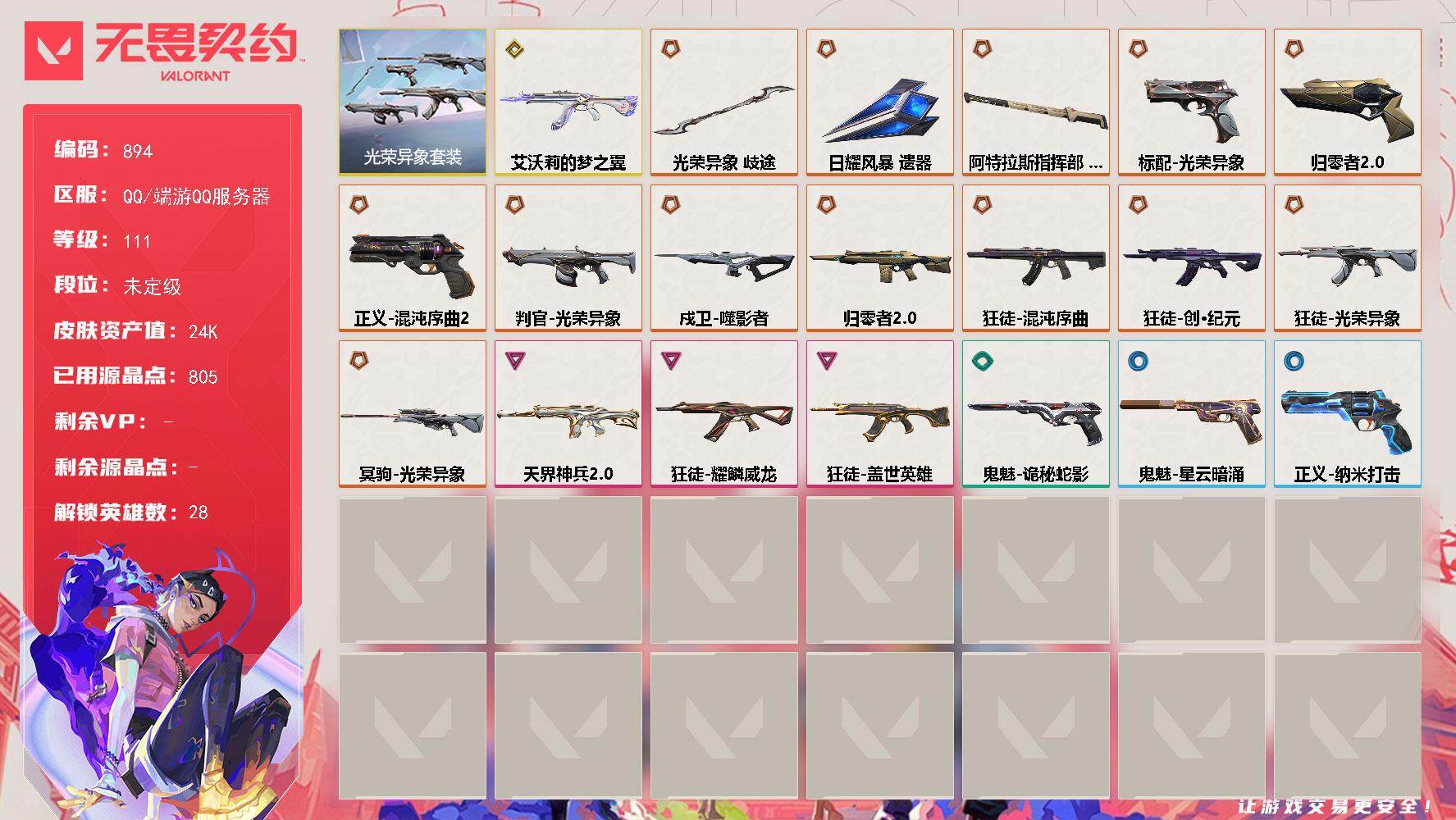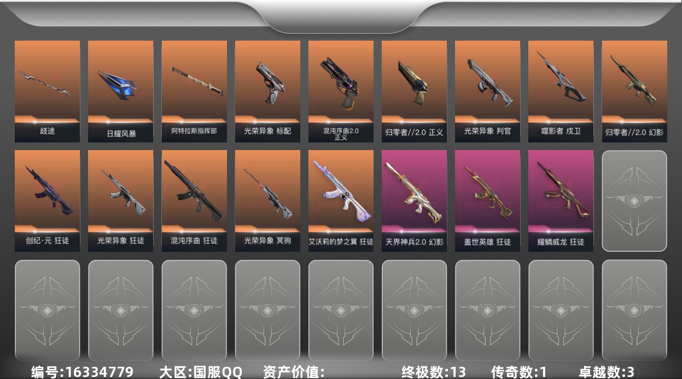 [16334779]【套装】:光荣异象套装 【英雄】:幻棱,炼狱,维斯,暮蝶,钛狐,壹决,铁臂,捷风,雷兹,幽影,不死鸟,贤者,猎枭,蝰蛇,零,芮娜,奇乐,尚勃勒,霓虹,斯凯,夜露,星礈,K/O,海神,盖可,黑梦,钢锁 【近战武器】:近战武器-光荣异象 歧途,近战武器-日耀风暴 遗器,近战武器-阿特拉斯指挥部 甩棍 【狂徒】:狂徒-艾沃莉的梦之翼,狂徒-混沌序曲,狂徒-创·纪元,狂徒-光荣异象,狂徒-盖世英雄,狂徒-耀鳞威龙 【幻影】:幻影-归零者//2.0,幻影-天界神兵//2.0 【戍卫】:戍卫-噬影者 【冥驹】:冥驹-光荣异象 【判官】:判官-光荣异象 【标配】:标配-光荣异象 【正义】:正义-归零者//2.0,正义-混沌序曲//2.0,正义-纳米打击 【鬼魅】:鬼魅-诡秘蛇影,鬼魅-星云暗涌 【卡面】:终章:激斗汉堡 卡面,进入射程 卡面,银弹猎手 卡面,《双城之战》拥抱 卡面,精灵大战 卡面,欢迎来到底城 卡面,南瓜盛典 卡面,正义的化身 卡面,红鳞松叶 卡面,源能反应 卡面,暂别喧嚣 卡面,无畏契约GO!第一卷:芮娜 卡面,无畏契约GO!第一卷:零 卡面,《双城之战》金克丝 卡面,无畏契约GO!第一卷:贤者 卡面,代号红色 卡面,新兵报到 卡面,V契约 卡面,无畏契约 卡面 【喷漆】:嗨宝南瓜灯 喷漆,嘭! 喷漆,都算到了 喷漆,控场勿近 喷漆,霓光四射 喷漆,买装还是存钱 喷漆,关门放狗 喷漆,胜利属于无畏契约 喷漆,GLHF 喷漆,无畏契约 喷漆 【挂饰】:终章:猫猫木乃伊 挂饰,悠闲鸡块 挂饰,伞绳 挂饰,《双城之战》小蛋糕 挂饰,第九季//第三幕 纪念币 挂饰,无畏契约GO!第一卷 芮娜 挂饰,无畏契约GO!第一卷 零 挂饰,第九季//第二幕 纪念币 挂饰,天外飞客 挂饰,无畏契约 纪念币 挂饰