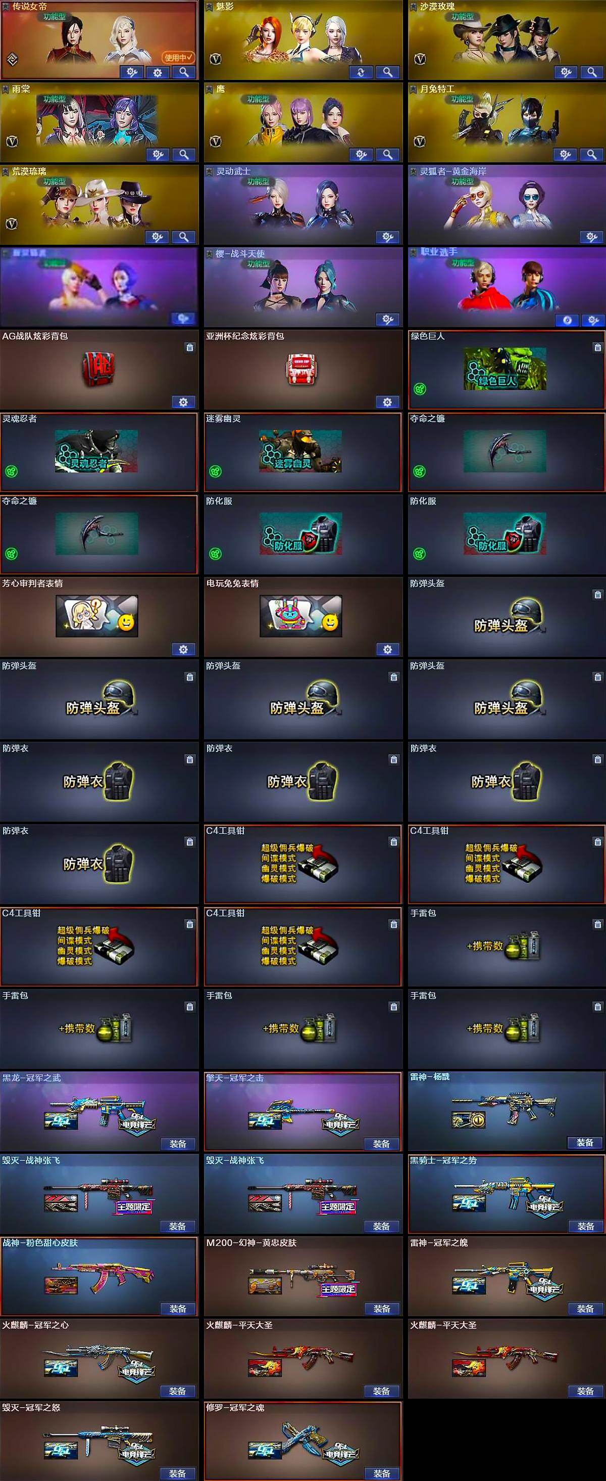 【道具】:AG战队炫彩背包,亚洲杯纪念炫彩背包,绿色巨人,灵魂忍者,迷雾幽灵,夺命之镰*2,防化服*2,芳心审判者表情,电玩兔兔表情,防弹头盔*4,防弹衣*4,C4工具钳*4,手雷包*4