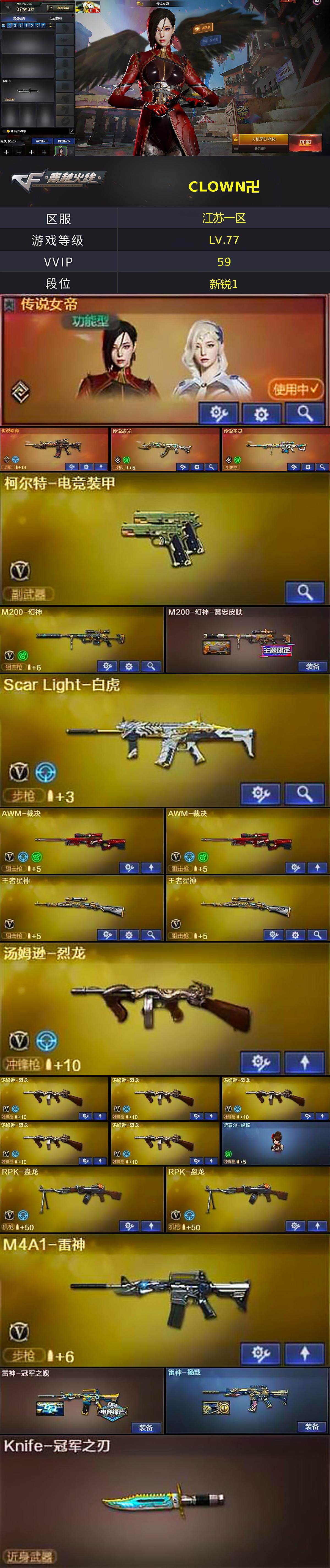[16334879]江苏一区-55V-7王者-6炫金 【传说武器】:传说暗裔,传说辉光,传说圣灵 【传说角色】:传说女帝 【热门武器】:传说暗裔,传说圣灵,传说辉光,M14EBR-玄武,Scar Light-白虎,M200-幻神,M4A1-黑骑士,汤姆逊-烈龙*6,RPK-盘龙*2,加特林-炼狱*3,斯泰尔-蝴蝶,羊驼玩偶*2,沙鹰-修罗*2,Knife-冠军之刃,黄金猫猫手套-白鲨 【王者炫金武器】:王者之影,王者龙血,炫金火麒麟,炫金武士,炫金修罗*4 【皮肤】:M200-幻神-黄忠皮肤,雷神-冠军之魄,雷神-杨戬,火麒麟-冠军之心,火麒麟-平天大圣*2,毁灭-冠军之怒,毁灭-战神张飞*2,黑龙-冠军之武,黑骑士-冠军之势,战神-粉色甜心皮肤,AK47-B-常胜将军-刘备,修罗-冠军之魂,擎天-冠军之击 【角色】:魅影,沙漠玫瑰,雨棠,鹰,月兔特工,荒漠琉璃,灵动武士,灵狐者-黄金海岸,新灵狐者,樱-战斗天使,职业选手 【人偶武器】:斯泰尔-蝴蝶,黄金迷你裂空之翼,迷你生化手雷,迷你超能女侍 【暴走生化】:超级对讲机 【挑战大师】:VEPR-12-金魔,试炼破坏者III 【英雄级武器】:AK47-火麒麟,M4A1-黑龙,M4A1-雷神,M4A1-黑骑士,M4A1-死神*3,Scar Light-白虎,M14EBR-玄武,M4A1-玫瑰精灵,超新星-悦享-觉醒版,AK47-B-战神,王者龙血-觉醒版,Barrett-毁灭,AWM-裁决*2,M200-幻神,Barrett-金色蔷薇,王者星神-觉醒版*2,王者森决-觉醒版,RPK-盘龙*2,加特林-炼狱*3,汤姆逊-烈龙*6,AA-12-雷霆,沙鹰-修罗*2,沙鹰-天神*3,柯尔特-电竞装甲,屠龙,擎天,麒麟刺*4 【道具】:AG战队炫彩背包,亚洲杯纪念炫彩背包,绿色巨人,灵魂忍者,迷雾幽灵,夺命之镰*2,防化服*2,芳心审判者表情,电玩兔兔表情,防弹头盔*4,防弹衣*4,C4工具钳*4,手雷包*4 【特殊枪械】:蝴蝶斯泰尔+6烈龙,1白虎,1黑骑士,6烈龙,2盘龙,3炼狱,1蝴蝶斯泰尔