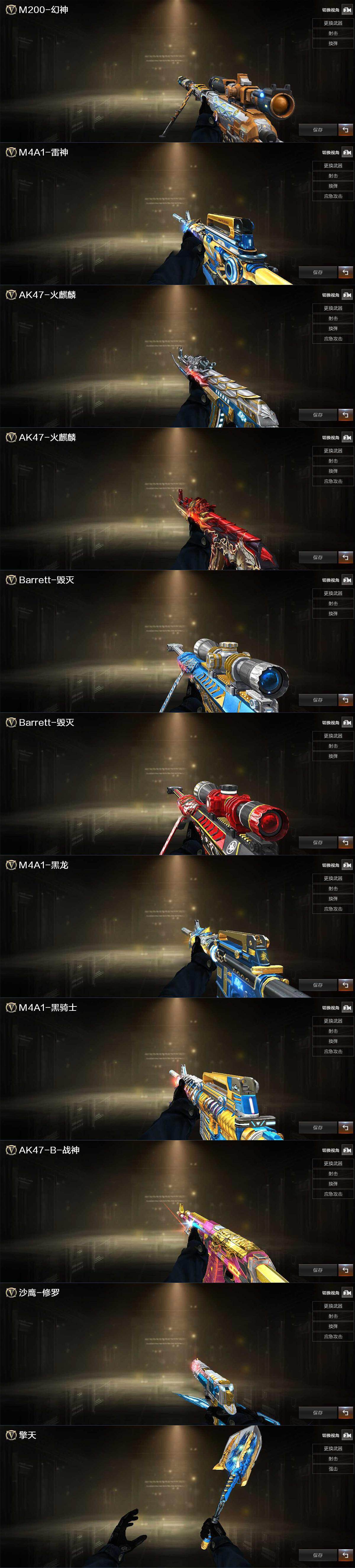 【英雄级武器】:AK47-火麒麟,M4A1-黑龙,M4A1-雷神,M4A1-黑骑士,M4A1-死神*3,Scar Light-白虎,M14EBR-玄武,M4A1-玫瑰精灵,超新星-悦享-觉醒版,AK47-B-战神,王者龙血-觉醒版,Barrett-毁灭,AWM-裁决*2,M200-幻神,Barrett-金色蔷薇,王者星神-觉醒版*2,王者森决-觉醒版,RPK-盘龙*2,加特林-炼狱*3,汤姆逊-烈龙*6,AA-12-雷霆,沙鹰-修罗*2,沙鹰-天神*3,柯尔特-电竞装甲,屠龙,擎天,麒麟刺*4