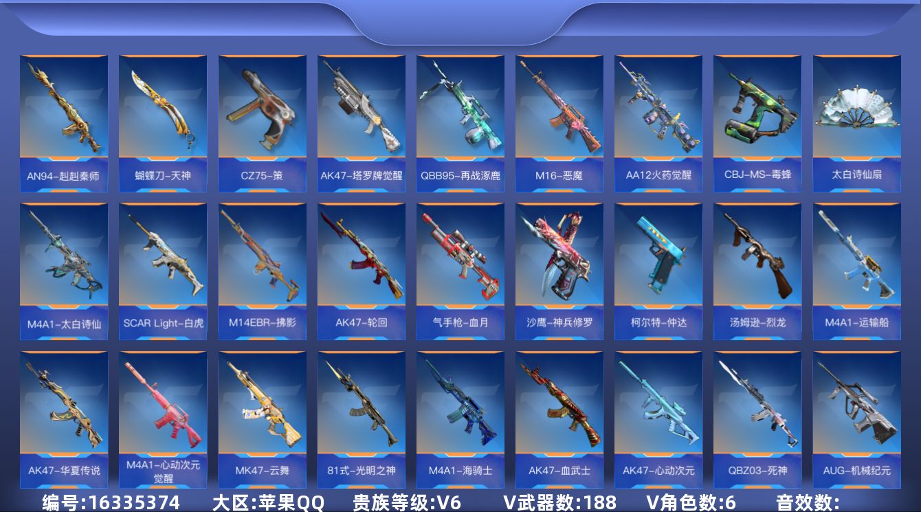 【英雄武器】:AK47-无影,AK47-火麒麟*3,AK47-心动次元,AK47-血武士,AK47-华夏传说,AK47-木兰,AK47-轮回,AK47-塔罗牌觉醒,M4A1-雷神*2,M4A1-黑骑士,M4A1-死神*2,M4A1-海骑士,M4A1-堕天神,M4A1-心动次元觉醒,M4A1-运输船,M4A1-太白诗仙,SCAR Light-白虎,SCAR-探星者,AN94-超新星,AN94-四凶觉醒,AN94-赳赳秦师,AUG-机械纪元,9A91-天神,M14EBR-拂影,M16-恶魔,QBZ03-金色蔷薇,QBZ03-死神,81式-光明之神,MK47-云舞,AWM-裁决,AWM-天使,巴雷特-毁灭*6,巴雷特-极光*2,巴雷特-极光-运动宝贝兰,巴雷特-冬灭觉醒,M200-心动次元觉醒,09式狙-天神,98K-黑骑士,98K-星神,TAC-晴舞,加特林-堡垒,QBB95-再战涿鹿,MK5-极光*2,汤姆逊-烈龙*2,寒霜烈龙,双持斯泰尔-天使,CBJ-MS-毒蜂,CZS2-心动次元觉醒,CZS2-血月,M12S-枪娘,PP19野牛-造纸术,打击者-天神,地狱火*2,地狱烈炎,AA12-火药觉醒,KSG-火力竞放,USP-神罚*2,USP-机械迷城*2,USP-太白诗仙,沙鹰-修罗*7,沙鹰-火麒麟,沙鹰-波塞冬,沙鹰-修罗-铁骑,气手枪-血月,沙鹰-神兵修罗,沙鹰-宇航兔兔,蟒蛇-火力竞放,改装GLOCK-木兰,改装GLOCK-黑龙,GLOCK18-宙斯,QSZ92-天使,柯尔特-仲达,柯尔特-伏刹山海觉醒,双持柯尔特-极光,CZ75-策,墨刃-幻神,蝴蝶刀-天神,龙啸,神罚战斧*4,镰刀-哈迪斯,手斧-机械迷城*2,秋逸,屠龙*3,血月,尼泊尔-雷霆,太白诗仙扇,麒麟刺,麒麟刺-堕天神,双脊龙趾,马来剑-毁灭*4,唐刀-大唐荣耀,擎天觉醒,斩魔刀,拳魔小巨兽,死神手雷,火麒麟手雷,高爆手雷-雷霆,雷神手雷,王者之影闪光弹,火麒麟闪光弹,闪光弹-雷霆,死神烟雾弹,王者之影烟雾弹,火麒麟烟雾弹,烟雾弹-堕天神