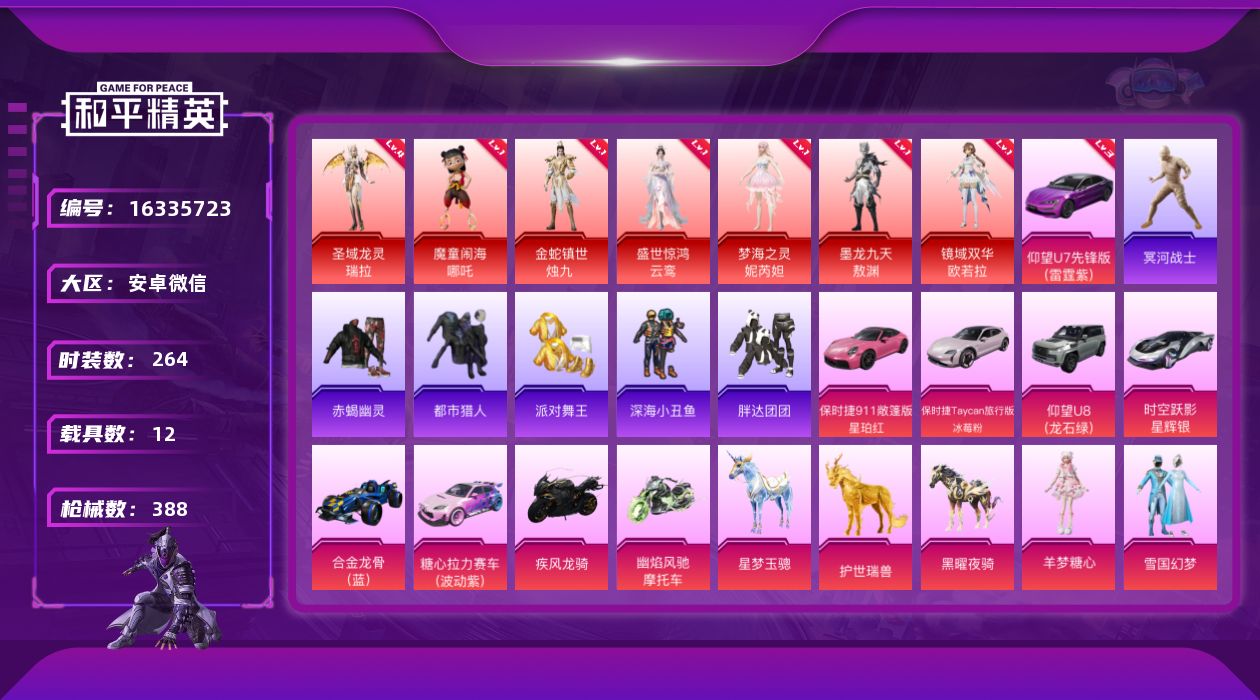 [16335723]可二次【特价出售/店主推荐】赤蝎 金鞋 都市 安卓 微信-7神装-32粉装-38特效枪-12载具-20粉色飞行器-171325热力值-21王牌印记-264套装-388枪皮 【红色载具】:仰望U7(雷霆紫)(三级) 【红色神装等级】:魔童闹海-哪吒(一级),圣域龙灵-瑞拉(四级),金蛇镇世-烛九(一级),盛世惊鸿-云鸾(一级),梦海之灵-妮芮妲(一级),墨龙九天-敖渊(一级),镜域双华-欧若拉(一级) 【红色角色神装】:魔童闹海-哪吒,圣域龙灵-瑞拉,金蛇镇世-烛九,盛世惊鸿-云鸾,梦海之灵-妮芮妲,墨龙九天-敖渊,镜域双华-欧若拉 【热门品类】:粉装-雪国幻梦,粉装-梦幻火箭,粉装-缤纷油彩,套装-浪漫天命,套装-赤蝎幽灵,套装-都市猎人,套装-冥河战士,套装-派对舞王,套装-深海小丑鱼,套装-胖达团团,套装-龟仙人,套装-暗影哥特,套装-粉红小猪,角色-Mark.06,角色-六号稻草人,熔岩游骑兵连帽夹克,套装-红熊茄茄 【粉色套装】:粉装-甜心巧克力,粉装-宝贝奶油派,粉装-天使彩虹糖,粉装-雪国幻梦,粉装-梦幻火箭,粉装-缤纷油彩,粉装-放客神游,粉装-新星烈龙,粉装-绚金战神,粉装-冰霜白皇,角色-洛天依,角色-初号机款机体服,粉装-流星咚咚,粉装-筑梦精灵,粉装-千面幻镜,粉装-第五大道,粉装-仲夏莫吉托,粉装-暖暖奶龙,粉装-傲傲奶龙,玩偶服-猪猪侠,角色-烟云彩露,角色-严莉莉,角色-小蓝,角色-美雪,角色-美琪,角色-光极星,套装-创世·救赎,角色-星梦奇缘,角色-千金淑猫,角色-樱桃泡泡,粉装-星穹咏叹调,角色-羊梦糖心 【粉色枪皮等级】:AKM-炫紫旋律(五级),AKM-幽焰骑士(六级),M16A4-垂柳戏鸭(一级),SCAR-L-童趣迷兔(一级),SCAR-L-青春物语(一级),SCAR-L-纯梦嫁纱(六级),SCAR-L-金蛇镇世(六级),SCAR-L-魔童闹海 哪吒(二级),M416-至情至圣(九级),M416-全功率超战(一级),M416-电玩时刻(五级),M416-墨龙九天(一级),M416-灵猫魔法师(六级),GROZA-巴啦啦小魔仙(一级),GROZA-精灵之光(三级),AUG-星梦奇缘(五级),M762-电糖天使(四级),ARX-无垠阁(三级),UMP45-雪国精灵(五级),UMP45-宇宙意志(一级),P90-电糖天使(一级