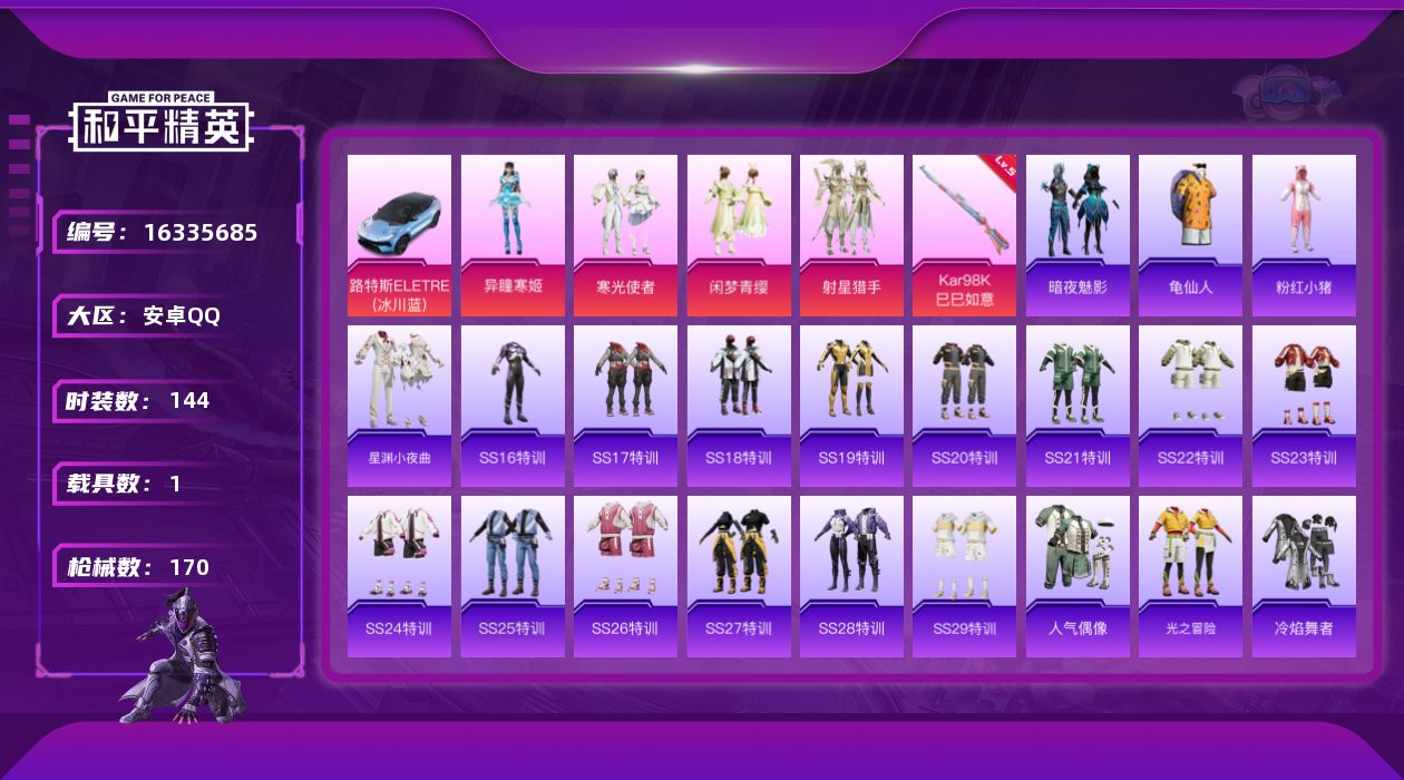 [16335685]【特价出售/店主推荐】安卓 手Q-4粉装-1特效枪-1载具-0粉色飞行器-53035热力值-16王牌印记-144套装-170枪皮