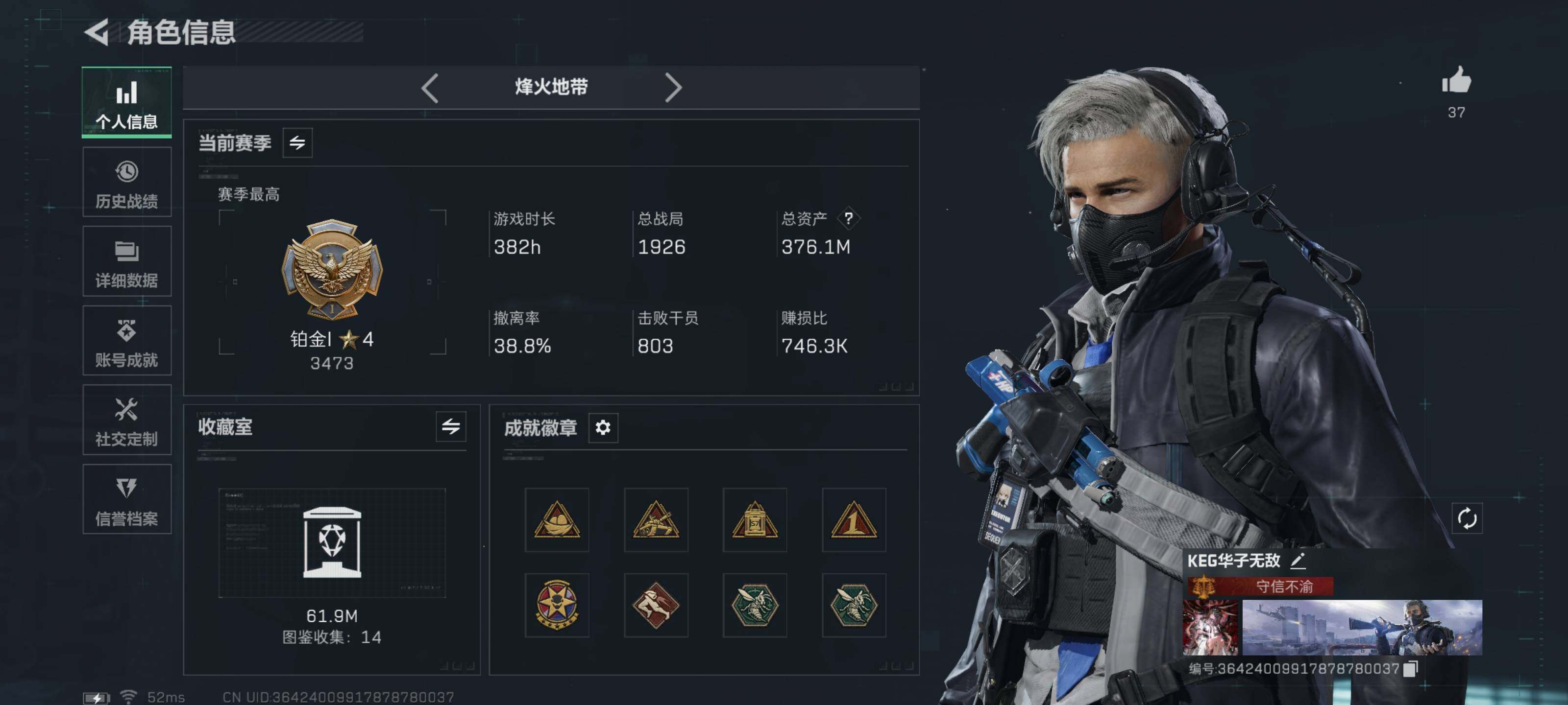 [16335906]【特价出售/店主推荐】376m总资产-109938k哈伏币-60烽火等级-铂金-50战场等级-校官