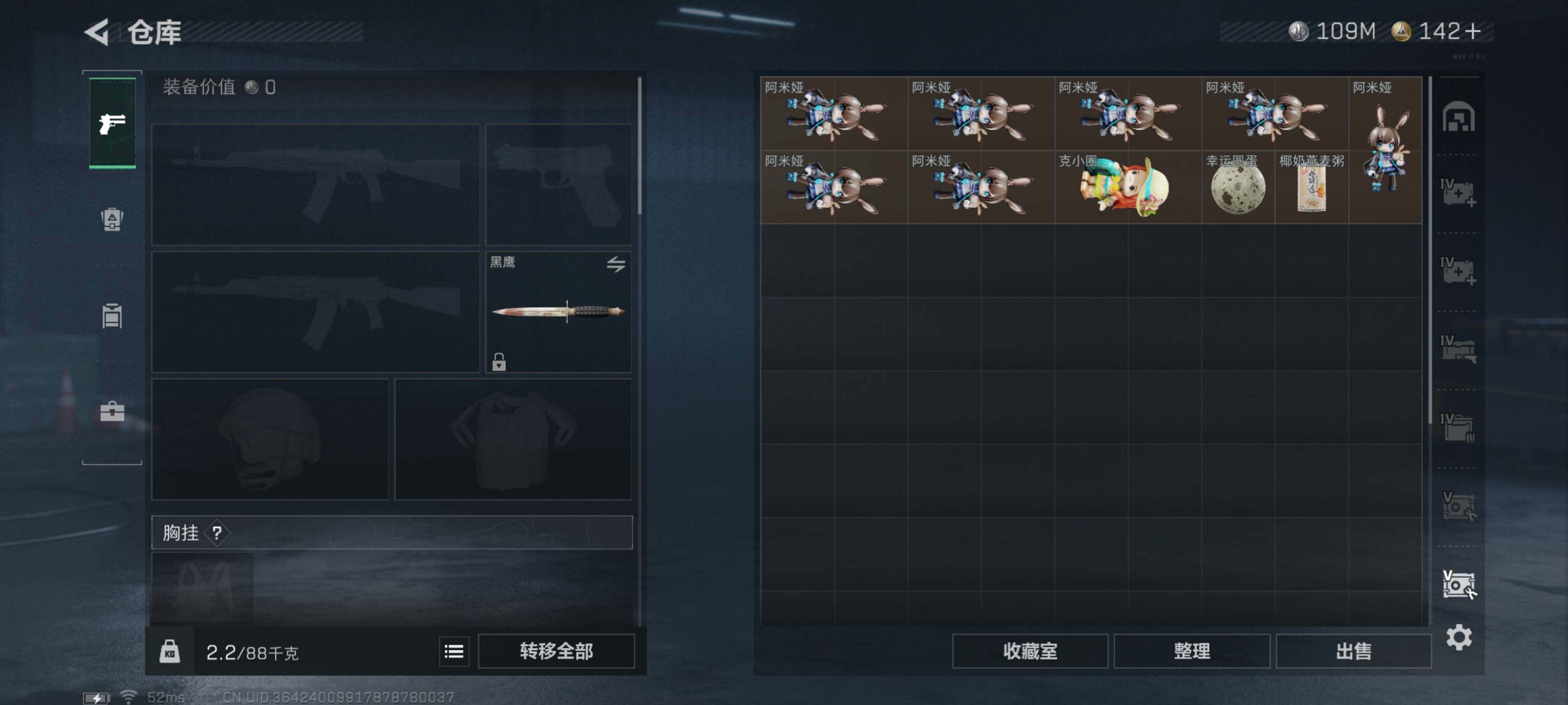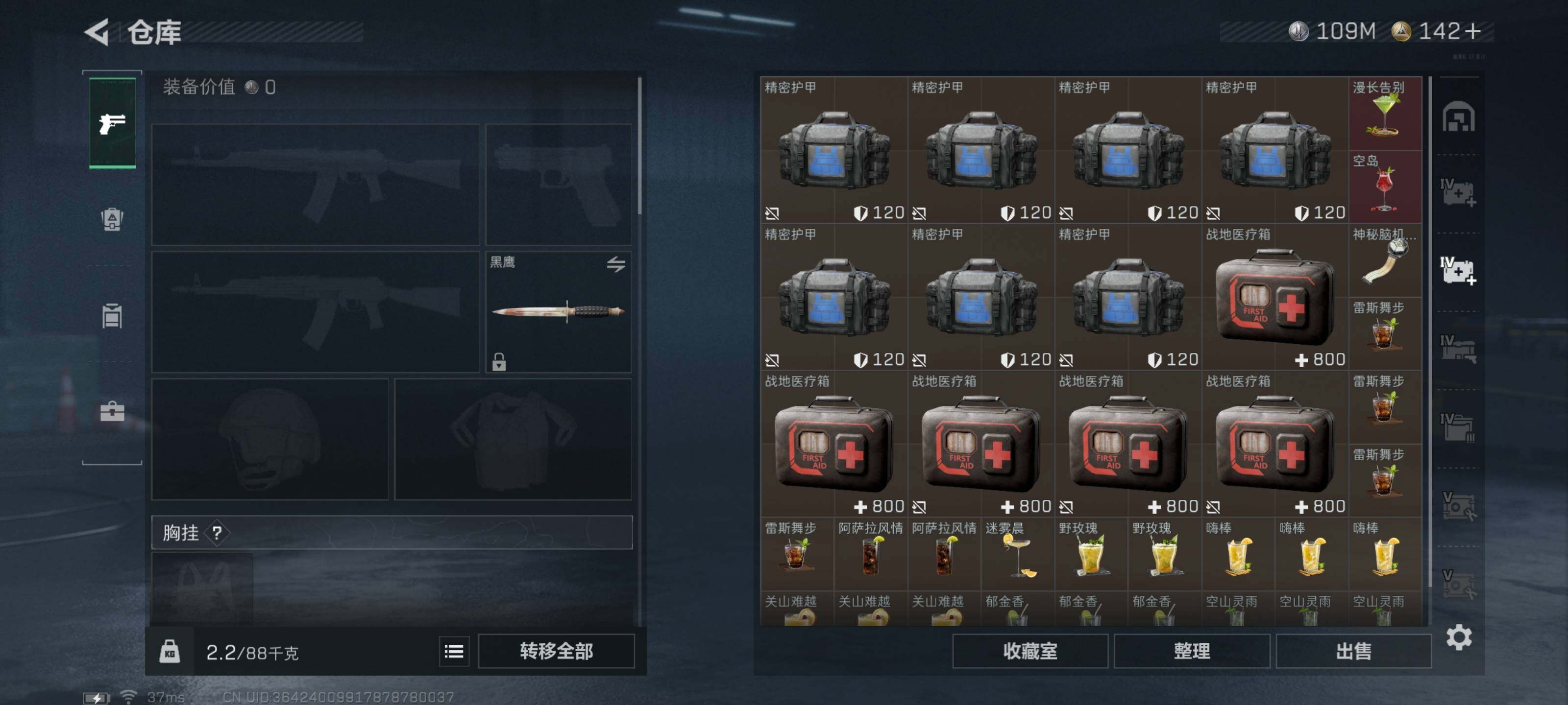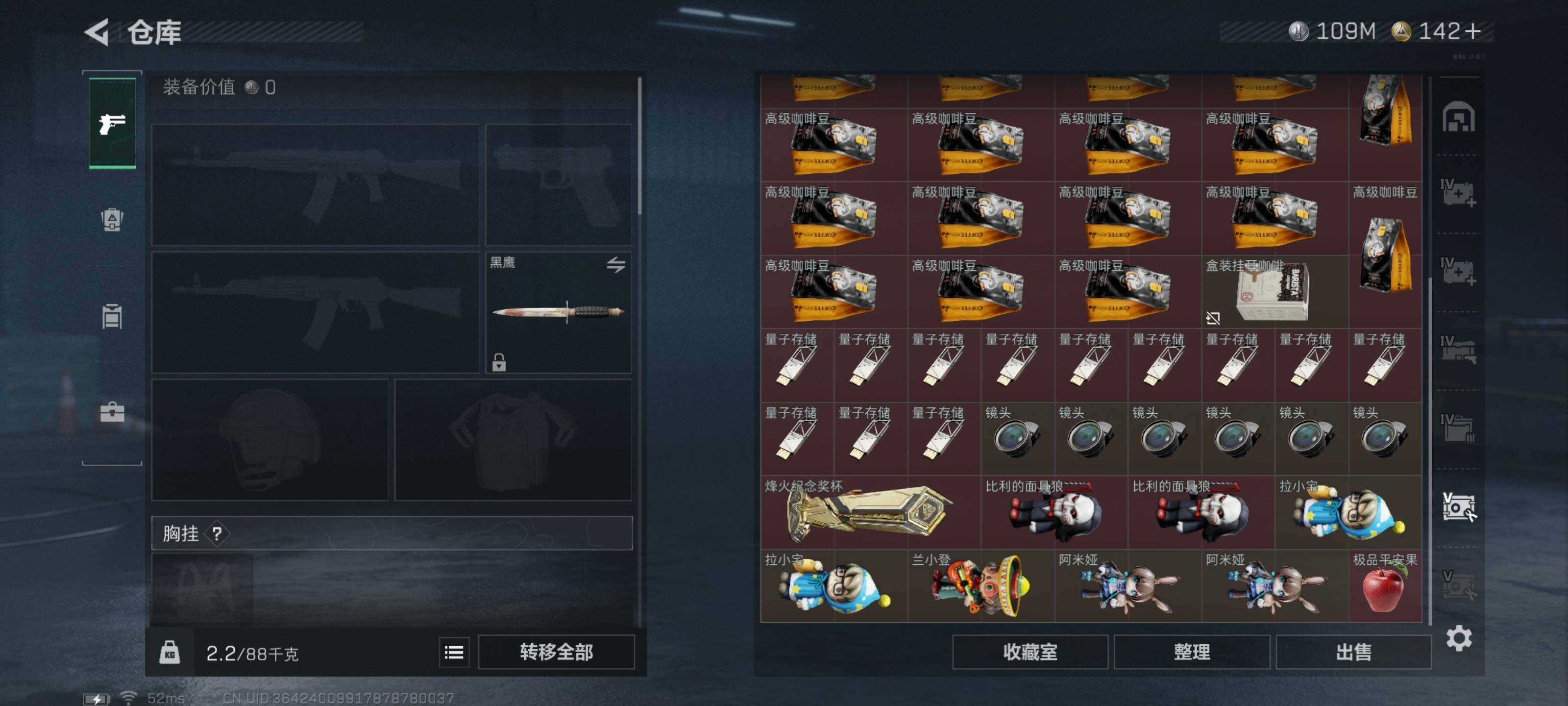 - [16299732]【店主推荐捡漏号!可直接换绑】,77421k哈伏币-220m流动资产-60烽火等级-钻石-1战场等级-无军衔 【干员外观】:红狼-电锯惊魂 【近战皮肤】:近战-黑鹰 【传说外观】:SG552突击步枪-运动员,SCAR-H战斗步枪-启航,KC17突击步枪-电锯惊魂,R93狙击步枪-维什戴尔 【史诗外观】:G3战斗步枪-流沙送葬,AS Val突击步枪-百步穿杨,MP5冲锋枪-战术竞备,MP5冲锋枪-竞技风,Vector冲锋枪-百步穿杨,Vector冲锋枪-异域战争,勇士冲锋枪-工业狂潮,M700狙击步枪-百步穿杨,AWM狙击步枪-流沙送葬 【稀有外观】:M4A1突击步枪-繁盛,AKM突击步枪-肃杀,QBZ95-1突击步枪-公平竞技,ASh-12战斗步枪-繁盛,M7战斗步枪-捣蛋鬼,腾龙突击步枪-冰天雪地,P90冲锋枪-黄昏,UZI冲锋枪-亚特兰蒂斯,勇士冲锋枪-主宰,勇士冲锋枪-冰天雪地,Mini-14射手步枪-荣耀列队,PSG-1射手步枪-主宰,G18-星链科技,G18-哈夫克航天 【普通外观】:MP5冲锋枪-古铜,M16A4突击步枪-高雅黑,AUG突击步枪-浅蓝涂装,M7战斗步枪-红色涂装,SG552突击步枪-海浪,AK-12突击步枪-变色龙,PTR-32突击步枪-黄蜂,CAR-15突击步枪-变色龙,K437突击步枪-磐石,SR-3M紧凑突击步枪-变色龙,M1014霰弹枪-海浪,M1014霰弹枪-变色龙,M250通用机枪-条纹,QJB201轻机枪-磐石,SVD狙击步枪-高雅黑,SR9射手步枪-磐石,R93狙击步枪-变色龙,QSZ92G-条纹 【载具外观】:轮式突击炮-荣耀 【军牌】:军牌-展示,军牌-零号大坝 【挂饰】:挂饰-赤霄游龙,挂饰-诡影狙击兵*2,挂饰-诡影喷火兵,挂饰-崩岩重炮,挂饰-暗行哨兵*2,挂饰-启程,挂饰-诡影狙击兵,挂饰-暗行哨兵,挂饰-黑鹰坠落