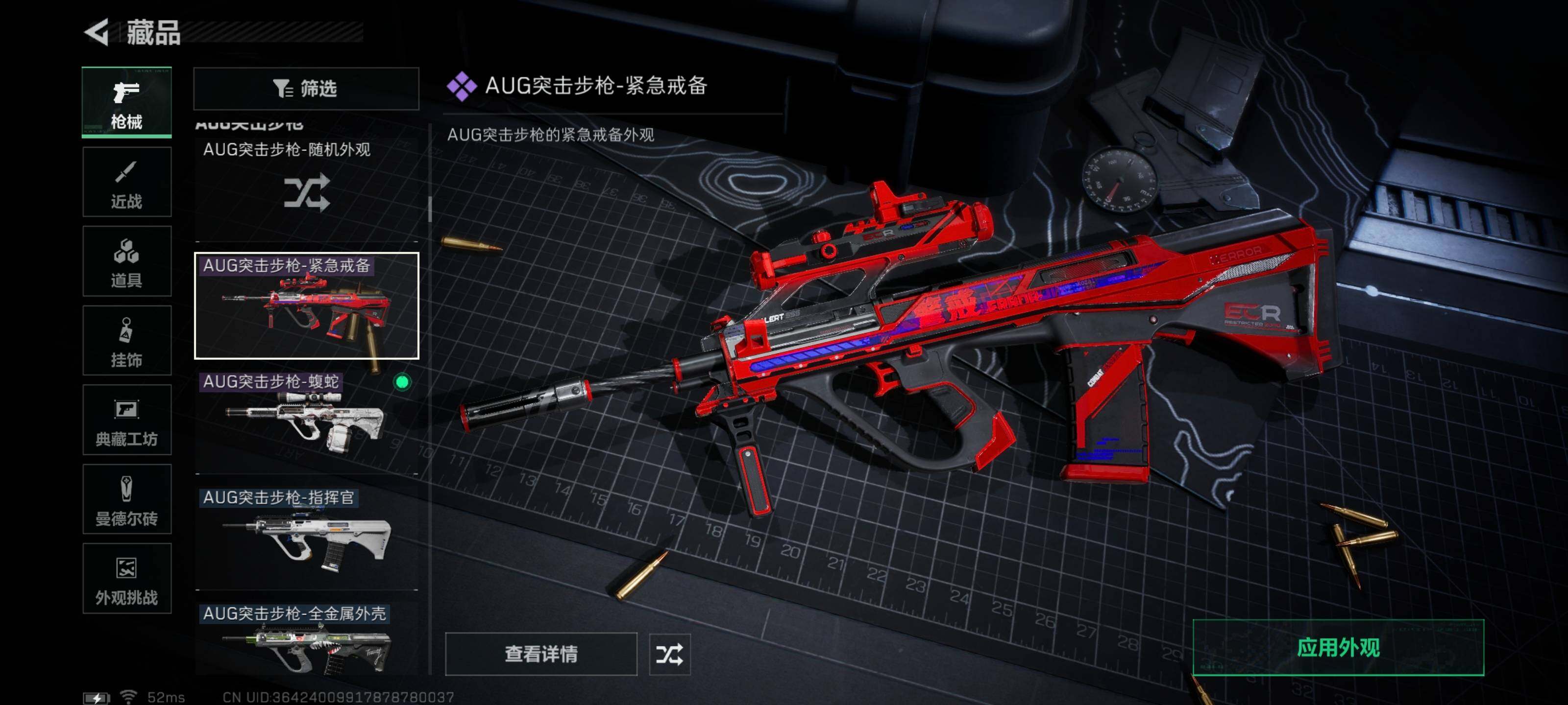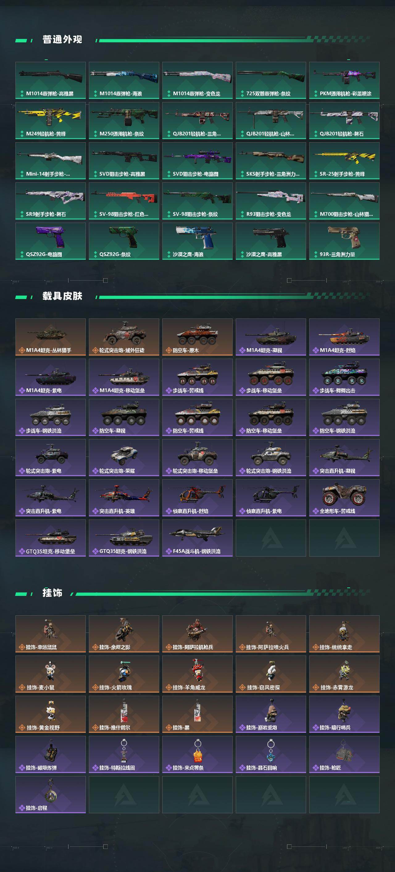 【史诗外观】:ASh-12战斗步枪-无极限,M16A4突击步枪-竞赛选手,AUG突击步枪-蝮蛇,M7战斗步枪-百步穿杨,SCAR-H战斗步枪-囚徒,G3战斗步枪-流沙送葬,PTR-32突击步枪-工业狂潮,AS Val突击步枪-典狱官,AS Val突击步枪-百步穿杨,腾龙突击步枪-无垢,K437突击步枪-守护者,MP5冲锋枪-深海恐惧,MP5冲锋枪-战术竞备,MP5冲锋枪-竞技风,Vector冲锋枪-阿萨拉文明,Vector冲锋枪-猎鳄行动,Vector冲锋枪-百步穿杨,Vector冲锋枪-异域战争,SR-3M紧凑突击步枪-荒野求生,SR-3M紧凑突击步枪-战术竞备,勇士冲锋枪-深海恐惧,勇士冲锋枪-工业狂潮,MP7冲锋枪-无垢,MP7冲锋枪-守护者,S12K霰弹枪-曙光,PKM通用机枪-蝮蛇,PKM通用机枪-荒野求生,M250通用机枪-囚徒,Mini-14射手步枪-守护者,SVD狙击步枪-荒野求生,M14射手步枪-工业狂潮,PSG-1射手步枪-无垢,SV-98狙击步枪-林中猎手,SV-98狙击步枪-囚徒,R93狙击步枪-竞赛选手,M700狙击步枪-竞技风,M700狙击步枪-蝮蛇,M700狙击步枪-百步穿杨,M700狙击步枪-哈夫克警备,AWM狙击步枪-无极限,AWM狙击步枪-流沙送葬,沙漠之鹰-曙光,复合弓-守护者
