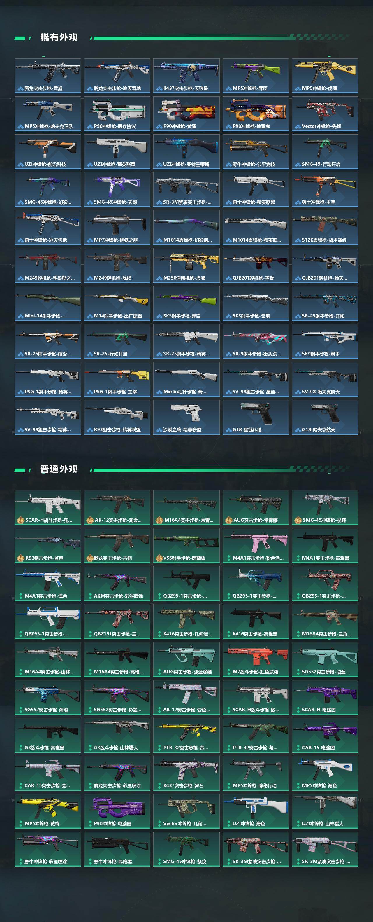 【传说外观】:M4A1突击步枪-蚀金玫瑰,M4A1突击步枪-阿米娅,ASh-12战斗步枪-鹅鸭杀,SG552突击步枪-运动员,AK-12突击步枪-特斯拉线圈,SCAR-H战斗步枪-启航,G3战斗步枪-骑士,CAR-15突击步枪-阿米娅,腾龙突击步枪-捞点薯条,KC17突击步枪-电锯惊魂,UZI冲锋枪-特斯拉线圈,SR-3M紧凑突击步枪-特斯拉线圈,勇士冲锋枪-能天使-午夜邮差,QCQ171冲锋枪-鹅鸭杀,725双管霰弹枪-送葬人-无题密令,M250通用机枪-骑士之心,QJB201轻机枪-鹅鸭杀,杠杆式步枪-纵横,AWM狙击步枪-捞点薯条,93R-捞点薯条,复合弓-黑·天际线