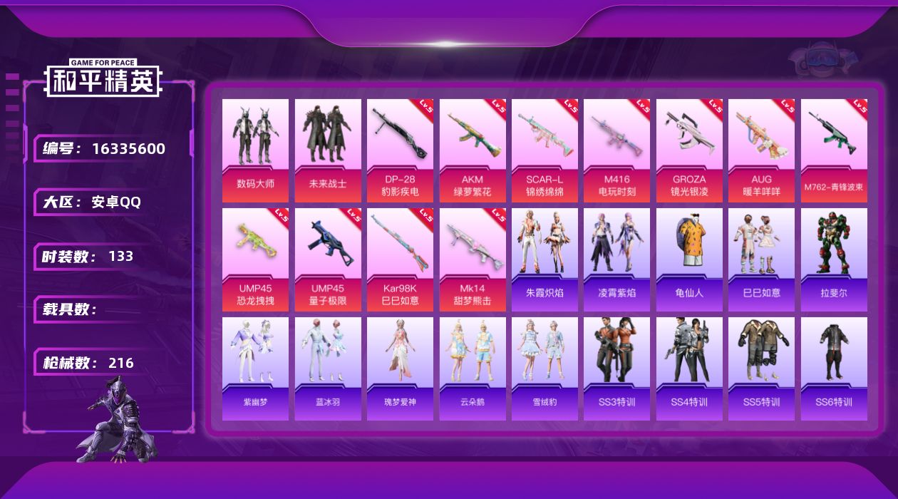 [16335600]【店主推荐捡漏号!可直接换绑】安卓 手Q-2粉装-11特效枪-0载具-0粉色飞行器-57642热力值-3王牌印记-133套装-216枪皮【热门品类】:套装-龟仙人【粉色套装】:粉装-数码大师,粉装-未来战士【粉色枪皮等级】:AKM-绿萝繁花(五级),SCAR-L-锦绣绵绵(五级),M416-电玩时刻(五级),GROZA-镜光银凌(五级),AUG-暖羊咩咩(五级),M762-青锋波束(五级),UMP45-恐龙拽拽(五级),UMP45-量子极限(五级),Kar98K-巳巳如意(五级),Mk14-甜梦熊击(五级),DP-28-豹影疾电(五级)【粉色枪皮】:AKM-绿萝繁花,SCAR-L-锦绣绵绵,M416-电玩时刻,GROZA-镜光银凌,AUG-暖羊咩咩,M762-青锋波束,UMP45-恐龙拽拽,UMP45-量子极限,Kar98K-巳巳如意,Mk14-甜梦熊击,DP-28-豹影疾电