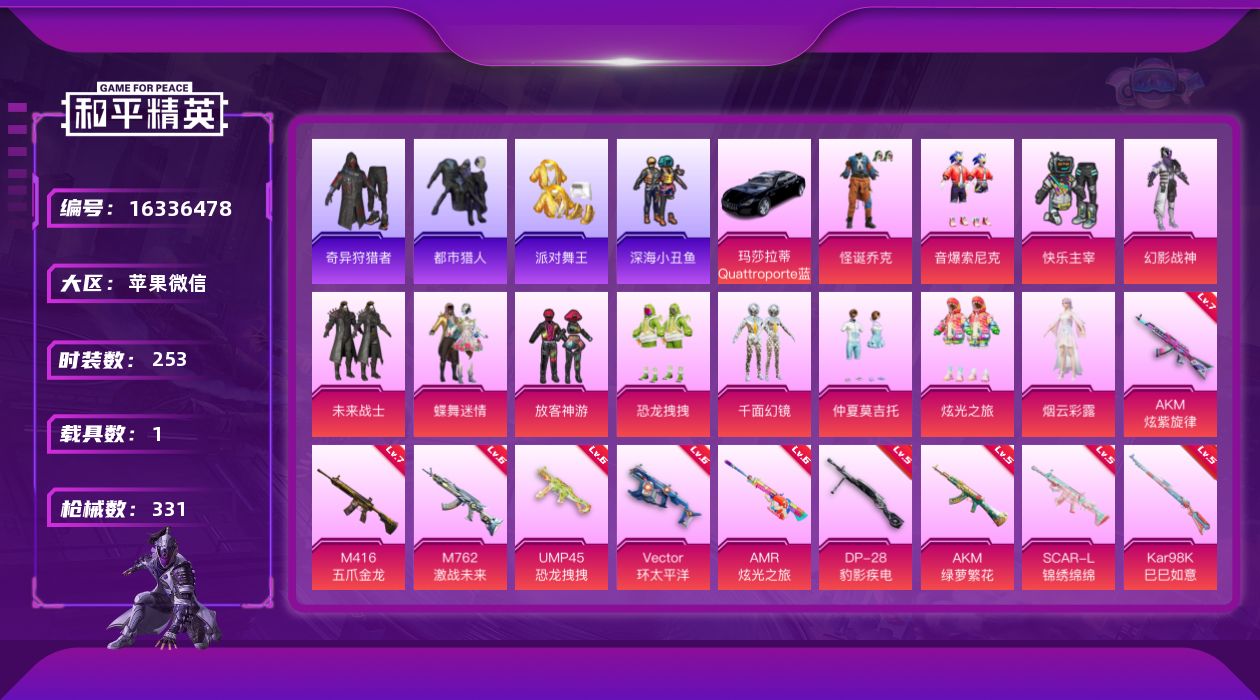 [16336478]可二次【特价出售/店主推荐】苹果 微信-无敌战神框-12粉装-11特效枪-1载具-6粉色飞行器-106700热力值-20王牌印记-253套装-331枪皮