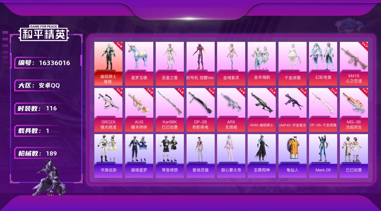 [16336016]【特价出售/店主推荐】安卓 手Q-无敌战神框-1神装-7粉装-11特效枪-1载具-7粉色飞行器-65017热力值-8王牌印记-116套装-189枪皮【红色神装等级】:幽焰骑士-维塔(四级)【红色角色神装】:幽焰骑士-维【热门品类】:套装-龟仙人,角色-Mark.06【粉色套装】:角色-圣堂之誓,角色-初号机 觉醒Ver.,角色-金域紫灵,粉装-金丰海韵,角色-千金淑猫,粉装-幻彩电音,角色-罪夜之【粉色枪皮等级】:AKM-幽焰骑士(三级),M416-心之恋语(七级),GROZA-镜光银凌(五级),AUG-暖羊咩咩(五级),ARX-无垠阁(四级),UMP45-宇宙意志(三级),AKS-74U-森灵之息(五级),Kar98K-巳巳如意(五级),DP-28-千金淑猫(三级),DP-28-豹影疾电(四级),MG-36-沧焰双生(一级)【粉色载具】:星梦玉骢【粉色枪皮】:AKM-幽焰骑士,M416-心之恋语,GROZA-镜光银凌,AUG-暖羊咩咩,ARX-无垠阁,UMP45-宇宙意志,AKS-74U-森灵之息,Kar98K-巳巳如意,DP-28-千金淑猫,DP-28-豹影疾电,MG-36-沧焰双生【粉色飞行器】:龙翔九天飞行器,深渊漩涡飞行器,幽焰列车飞行器,凤舞九天飞行器,万象金身飞行器,极意拳锋飞行器