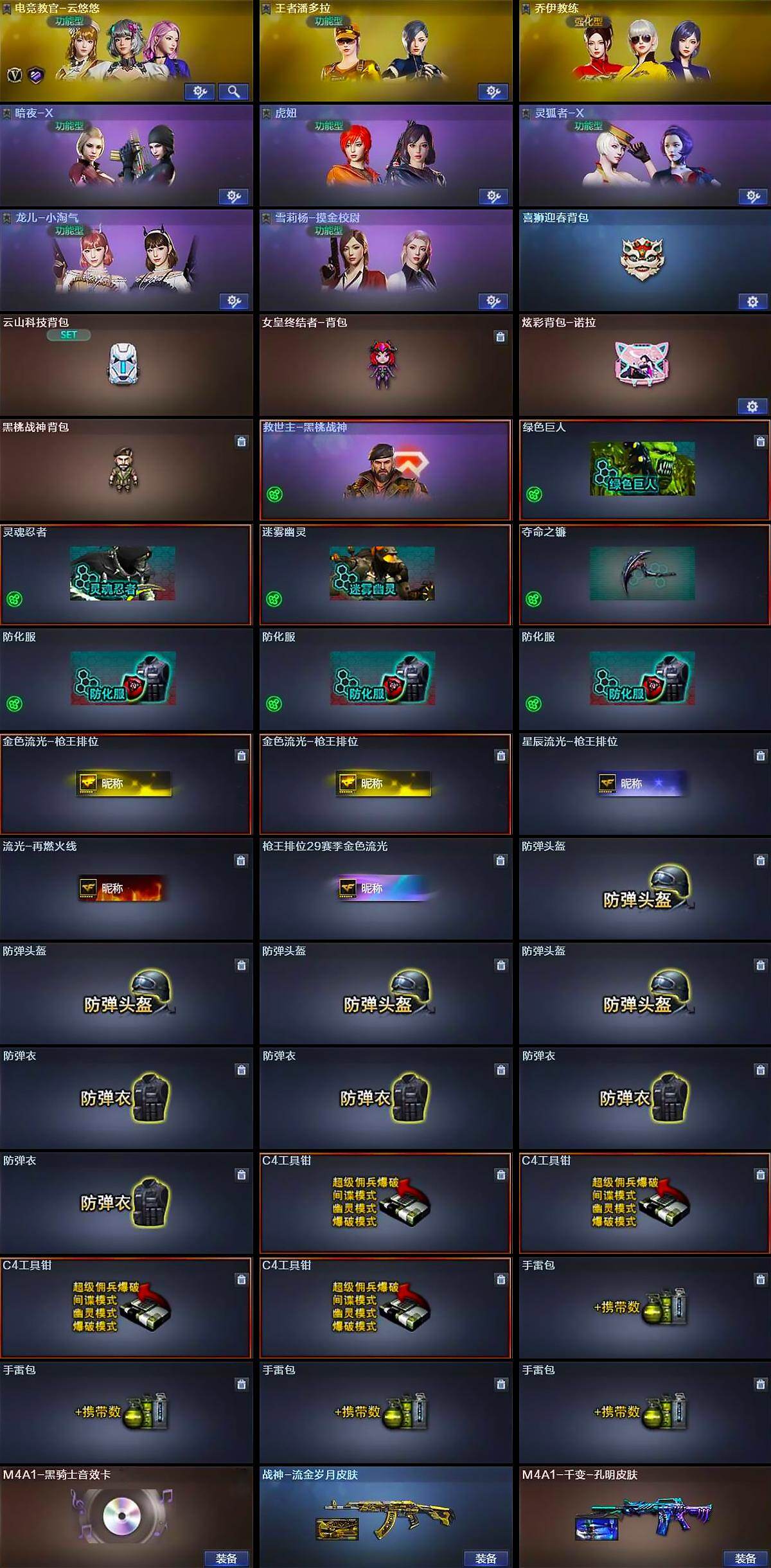 【道具】:喜狮迎春背包,云山科技背包,女皇终结者-背包,炫彩背包-诺拉,黑桃战神背包,救世主-黑桃战神,绿色巨人,灵魂忍者,迷雾幽灵,夺命之镰,防化服*3,金色流光-枪王排位*2,星辰流光-枪王排位,流光-再燃火线,枪王排位29赛季金色流光,防弹头盔*4,防弹衣*4,C4工具钳*4,手雷包*4