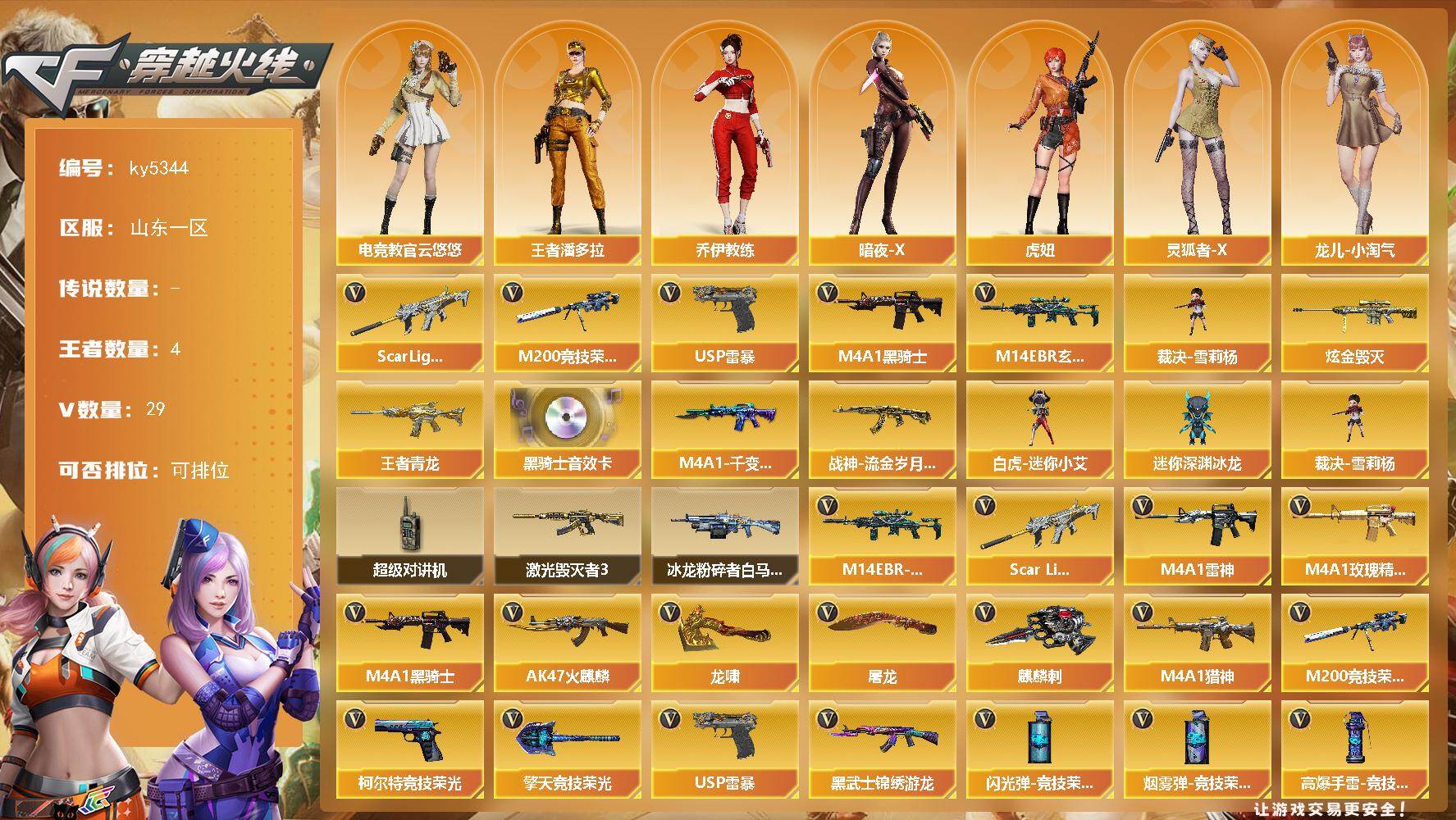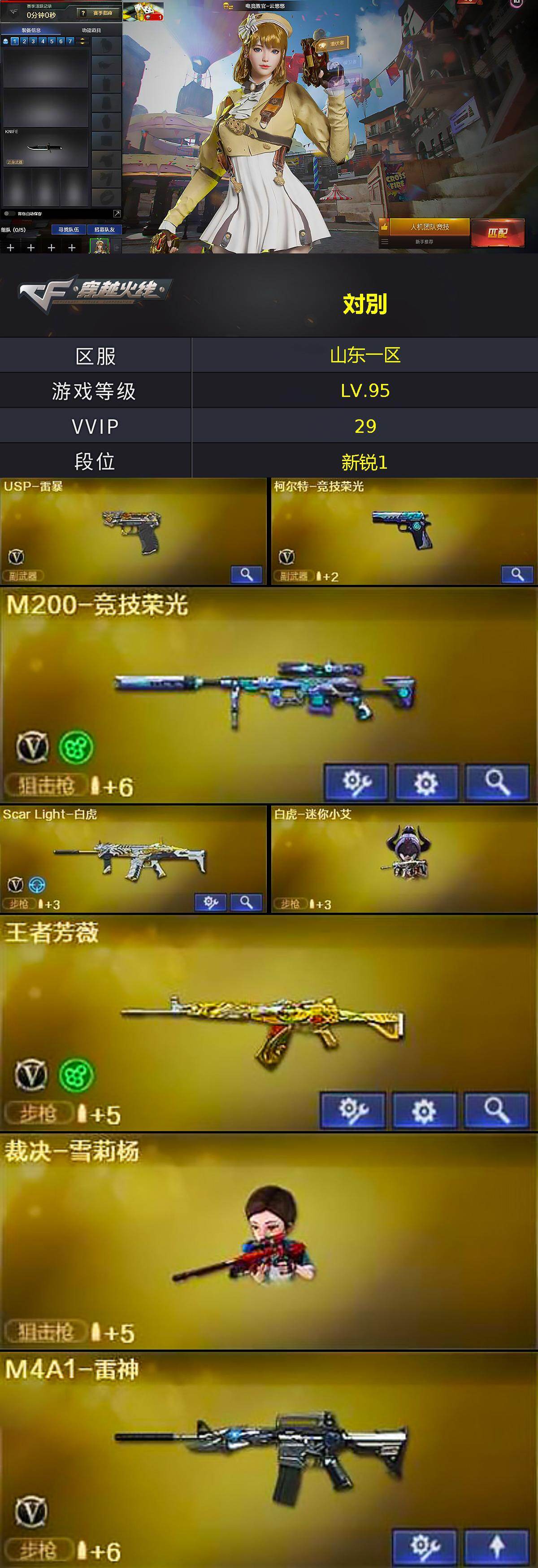 [16336558]山东一区-31V-4王者武器数-1炫金武器数 【热门武器】:M14EBR-玄武,Scar Light-白虎,M200-竞技荣光,M4A1-黑骑士,裁决-雪莉杨,USP-雷暴 【王者炫金武器】:王者青龙,炫金毁灭 【音效卡】:M4A1-黑骑士音效卡 【皮肤】:M4A1-千变-孔明皮肤,战神-流金岁月皮肤 【角色】:电竞教官-云悠悠,王者潘多拉,乔伊教练,暗夜-X,虎妞,灵狐者-X,龙儿-小淘气,雪莉杨-摸金校尉 【人偶武器】:裁决-雪莉杨,白虎-迷你小艾,迷你深渊冰龙 【暴走生化】:超级对讲机 【挑战大师】:冰龙粉碎者-白马银枪*2,激光毁灭者III 【英雄级武器】:AK47-火麒麟,M4A1-雷神,M4A1-黑骑士,Scar Light-白虎,M14EBR-玄武,黑武士-锦绣游龙,M4A1-玫瑰精灵,M4A1-猎神,王者芳薇-觉醒版,黑武士-CF网剧冠军,M200-竞技荣光,炼狱-悦蓝-觉醒版,USP-雷暴,柯尔特-竞技荣光,天神-CF网剧冠军,屠龙,龙啸,麒麟刺,擎天-竞技荣光,擎天-CF网剧冠军,高爆手雷-竞技荣光*3,闪光弹-竞技荣光*3,烟雾弹-竞技荣光*2,M4A1-赤狱骑士 【道具】:喜狮迎春背包,云山科技背包,女皇终结者-背包,炫彩背包-诺拉,黑桃战神背包,救世主-黑桃战神,绿色巨人,灵魂忍者,迷雾幽灵,夺命之镰,防化服*3,金色流光-枪王排位*2,星辰流光-枪王排位,流光-再燃火线,枪王排位29赛季金色流光,防弹头盔*4,防弹衣*4,C4工具钳*4,手雷包*4 【特殊枪械】:1白虎,1黑骑士