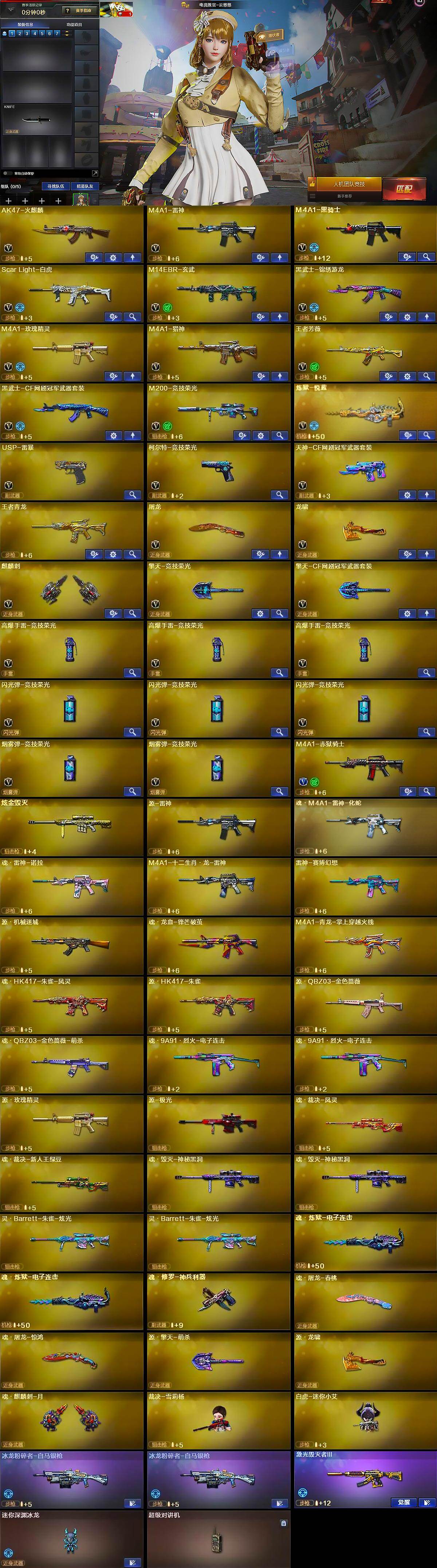 【英雄级武器】:AK47-火麒麟,M4A1-雷神,M4A1-黑骑士,Scar Light-白虎,M14EBR-玄武,黑武士-锦绣游龙,M4A1-玫瑰精灵,M4A1-猎神,王者芳薇-觉醒版,黑武士-CF网剧冠军,M200-竞技荣光,炼狱-悦蓝-觉醒版,USP-雷暴,柯尔特-竞技荣光,天神-CF网剧冠军,屠龙,龙啸,麒麟刺,擎天-竞技荣光,擎天-CF网剧冠军,高爆手雷-竞技荣光*3,闪光弹-竞技荣光*3,烟雾弹-竞技荣光*2,M4A1-赤狱骑士