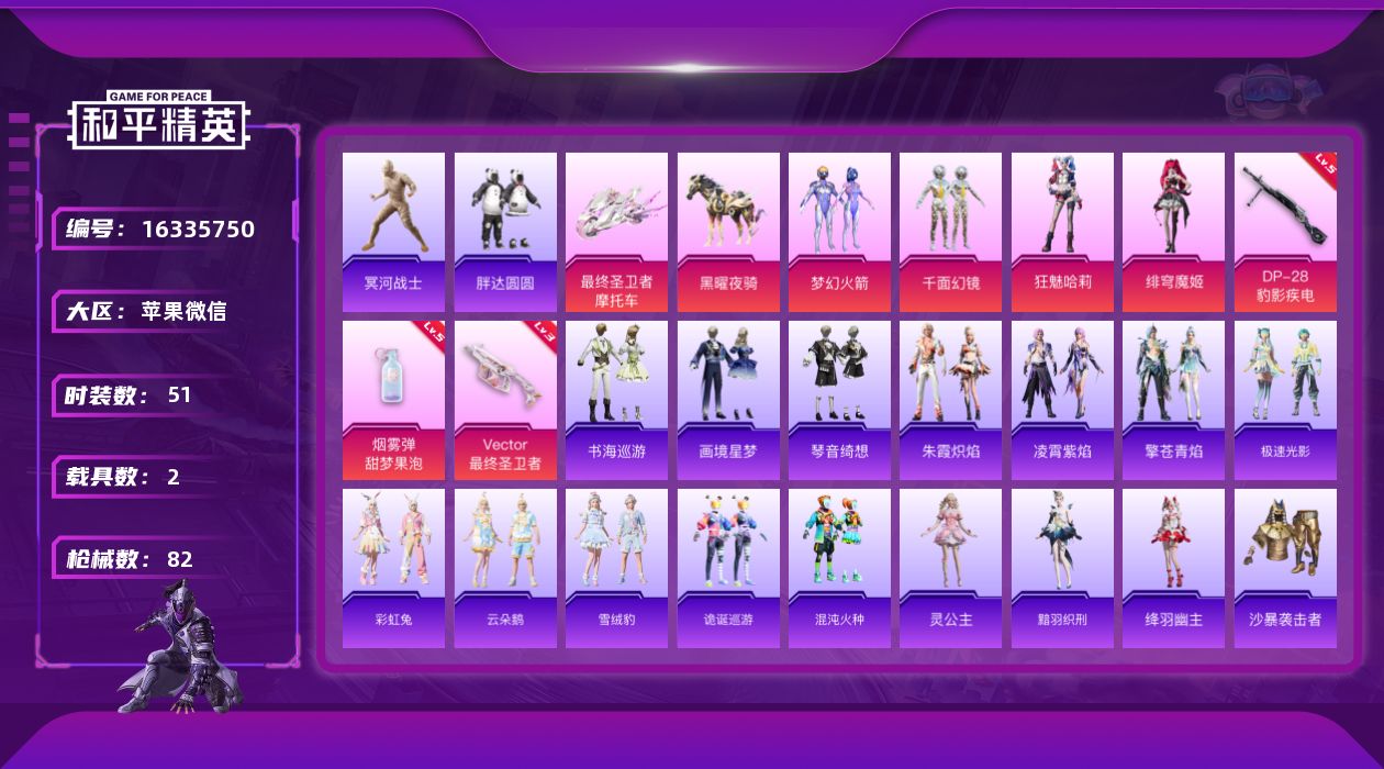 [16335750]可二次【特价出售/店主推荐】苹果 微信-4粉装-4特效枪-2载具-4粉色飞行器-26897热力值-3王牌印记-51套装-82枪皮 【热门品类】:粉装-梦幻火箭,套装-冥河战士,套装-胖达圆圆 【粉色套装】:粉装-梦幻火箭,粉装-千面幻镜,角色-狂魅哈莉,角色-绯穹魔姬 【粉色枪皮等级】:Vector-最终圣卫者(三级),AKS-74U-森灵之息(五级),DP-28-豹影疾电(五级),烟雾弹-甜梦果泡(五级) 【粉色载具】:最终圣卫者摩托车,黑曜夜骑 【粉色枪皮】:Vector-最终圣卫者,AKS-74U-森灵之息,DP-28-豹影疾电,烟雾弹-甜梦果泡 【粉色飞行器】:齐天大圣飞行器,终晖之翼飞行器,灵猫魔法师飞行器,极意拳锋飞行器 【粉色降落伞】:第五大道降落伞,信仰神谕降落伞,幻彩电音降落伞,双重狂想降落伞,最终圣卫者降落伞,冷漠罗丽降落伞,灵猫魔法师降落伞,炫彩糖果降落伞 【稀有套装】:套装-雪国风尚,套装-极速光影,套装-彩虹兔,套装-云朵鹅,套装-雪绒豹,套装-诡诞巡游,套装-混沌火种,角色-灵公主,角色-黯羽织刑,角色-绛羽幽主,套装-朱霞炽焰,套装-凌霄紫焰,套装-擎苍青焰,套装-书海巡游,套装-画境星梦,套装-琴音绮想 【稀有枪皮】:AKM-影袭,AKM-灵猫魔法师,M16A4-冥河战士,M16A4-最终圣卫者,SCAR-L-绯月迷踪,GROZA-荧海星豚,M762-天降萌叽,M762-云朵鹅,M762-登顶巅峰,G36C-蛇蝎美人,蜜獾-千面幻镜,ACE32-画境星梦,ARX-凌霄紫焰,UZI-影袭,UMP45-夜灯,UMP45-生命誓言,UMP45-极意拳锋,汤姆逊-天降萌叽,野牛-最终圣卫者,MP5K-画境星梦,JS9-凌霄紫焰,Kar98K-梦幻火箭,Kar98k-最终圣卫者,M24-影袭,M24-幻彩电音,Mini14-梦幻火箭,M200-爆裂游戏,SVD-云朵鹅,SVD-冷漠罗丽,M1加兰德-画境星梦,S686-生命誓言,S1897-荧海星豚,S12K-破晓战魂,S12K-夜灯,DBS-歌者泠鸢,DBS-绯月迷踪,DBS-幻彩电音,AA12-G-画境星梦,SPAS-12-云朵鹅,M249-绯穹魔姬,MG3-幻世战舞者,MG-36-凌霄紫焰,P92-凌霄紫焰,R45-幻彩电音,沙漠之鹰-云朵鹅,爆炸猎弓-喜羊羊与灰太狼,大砍刀-云朵鹅,撬