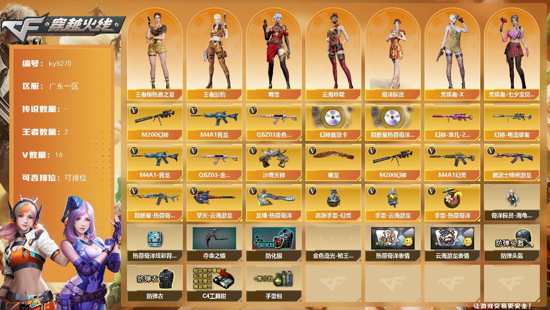 [16335292]广东一区-16V-2王者-0炫金 【热门武器】:QBZ03-金色蔷薇,M4A1-青龙,M200-幻神 【音效卡】:AN94-超新星-热带奇洋音效卡,M200-幻神音效卡 【皮肤】:幻神-宠儿-2021MVP,幻神-电流骇客 皮肤 【角色】:王者樱-热浪之夏,王者影豹,奇洋探员,云海玲珑,灵狐者-X,灵狐者-七夕宝贝,曼陀罗-礼服,潘多拉-X,蜀雪,游珑儿 【英雄级武器】:M4A1-青龙,M4A1-幻灵,黑武士-锦绣游龙,超新星-热带奇洋,QBZ03-金色蔷薇,M200-幻神,沙鹰-天神*4,屠龙,擎天-云海游龙,龙啸-热带奇洋,高爆手雷-幻灵,手雷-云海游龙,手雷-热带奇洋 【道具】:奇洋探员-海龟背包,热带奇洋炫彩背包,夺命之镰,防化服,金色流光-枪王排位,星辰流光-枪王排位,枪王排位28赛季金色流光,热带奇洋表情,云海游龙表情,防弹头盔,防弹衣,C4工具钳,手雷包 【特殊枪械】:
