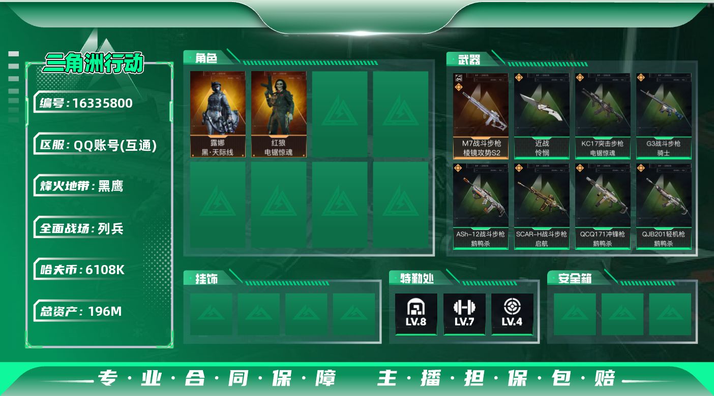 [16335800]【特价出售/店主推荐】196m总资产-6108k哈伏币-60烽火等级-黑鹰-9战场等级-列兵 【干员外观】:露娜-黑·天际线,红狼-电锯惊魂 【近战皮肤】:近战-怜悯,近战-黑鹰 【典藏外观】:M7战斗步枪-棱镜攻势S2 【传说外观】:M4A1突击步枪-蚀金玫瑰,M4A1突击步枪-阿米娅,ASh-12战斗步枪-鹅鸭杀,AK-12突击步枪-特斯拉线圈,SCAR-H战斗步枪-启航,G3战斗步枪-骑士,CAR-15突击步枪-阿米娅,腾龙突击步枪-捞点薯条,KC17突击步枪-电锯惊魂,Vector冲锋枪-能天使-午夜邮差,UZI冲锋枪-特斯拉线圈,SR-3M紧凑突击步枪-特斯拉线圈,勇士冲锋枪-能天使-午夜邮差,QCQ171冲锋枪-鹅鸭杀,QJB201轻机枪-鹅鸭杀,AWM狙击步枪-捞点薯条,93R-捞点薯条,复合弓-黑·天际线 【史诗外观】:AKM突击步枪-林中猎手,QBZ95-1突击步枪-曙光,M16A4突击步枪-竞赛选手,AUG突击步枪-蝮蛇,SG552突击步枪-深海恐惧,SCAR-H战斗步枪-囚徒,腾龙突击步枪-猎鳄行动,MP5冲锋枪-战术竞备,MP5冲锋枪-竞技风,SR-3M紧凑突击步枪-战术竞备,勇士冲锋枪-深海恐惧,勇士冲锋枪-工业狂潮,M1014霰弹枪-林中猎手,S12K霰弹枪-曙光,PKM通用机枪-蝮蛇,M250通用机枪-囚徒,SV-98狙击步枪-林中猎手,SV-98狙击步枪-囚徒,M700狙击步枪-竞技风,M700狙击步枪-蝮蛇,M700狙击步枪-哈夫克警备,沙漠之鹰-曙光 【稀有外观】:M700狙击步枪-极地勘察队,UZI冲锋枪-旧梦,SG552突击步枪-巨兽,AKM突击步枪-肃杀,QBZ95-1突击步枪-公平竞技,M7战斗步枪-捣蛋鬼,SCAR-H战斗步枪-童趣,SCAR-H战斗步枪-荣耀列队,PTR-32突击步枪-天网,PTR-32突击步枪-英雄,腾龙突击步枪-冰天雪地,MP5冲锋枪-弄臣,MP5冲锋枪-虎啸,MP5冲锋枪-哈夫克卫队,P90冲锋枪-浅鲨小队,P90冲锋枪-新生,P90冲锋枪-黄昏,Vector冲锋枪-先锋,UZI冲锋枪-前沿科技,UZI冲锋枪-亚特兰蒂斯,野牛冲锋枪-前沿科技,野牛冲锋枪-精英联盟,SMG-45-行动开启,SMG-45冲锋枪-幻影结构,SMG-45冲锋枪-天网,勇士冲锋枪-冰天雪地,M1014霰弹枪-幻影结构,M