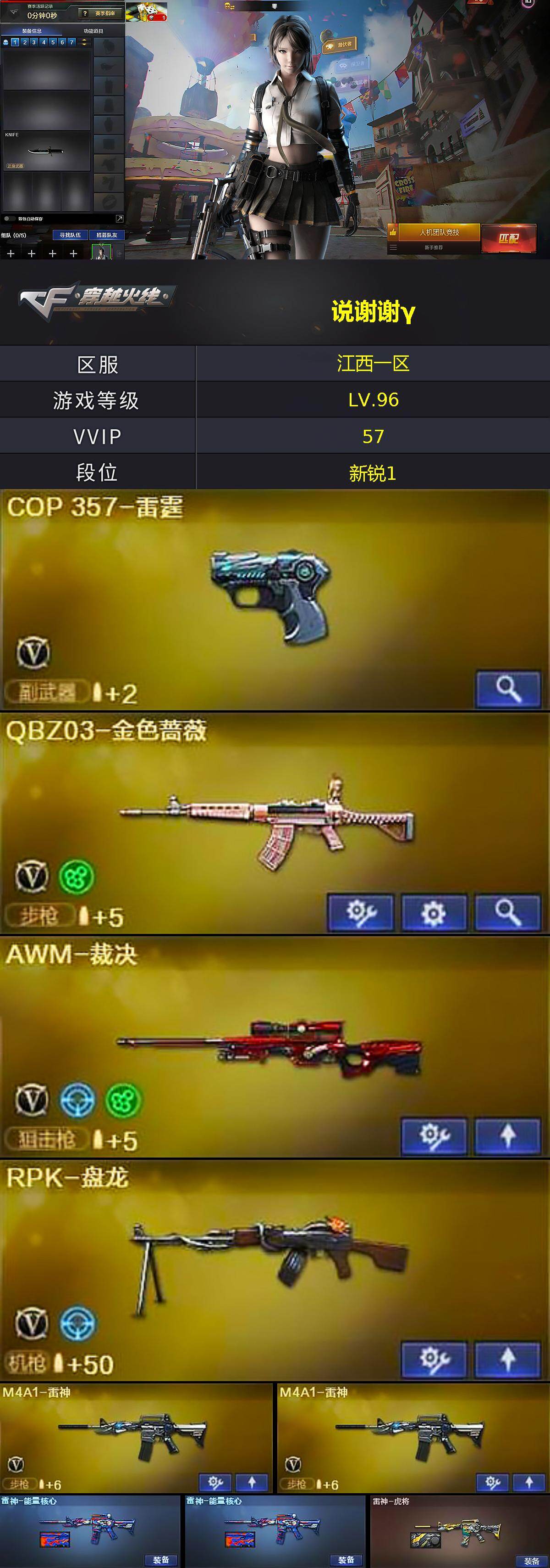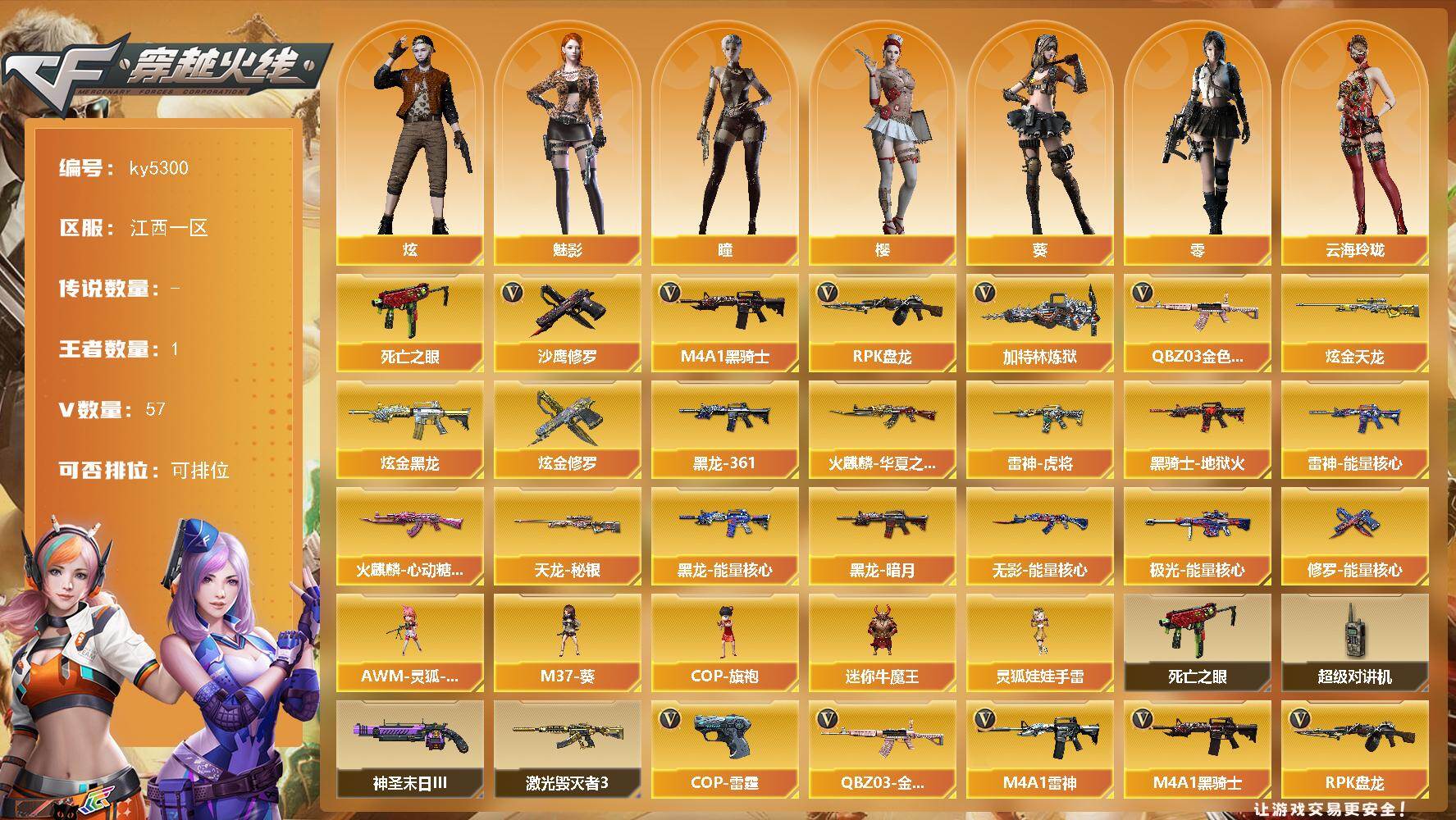 [16335810]江西一区-58V-1王者武器数-3炫金武器数 【热门武器】:QBZ03-金色蔷薇,死亡之眼,M4A1-黑骑士,RPK-盘龙,加特林-炼狱,沙鹰-修罗*2 【王者炫金武器】:炫金黑龙,炫金天龙,炫金修罗 【皮肤】:雷神-能量核心*2,雷神-虎将,火麒麟-华夏之心,火麒麟-心动糖果,黑龙-能量核心,黑龙-暗月,M4A1-黑龙-361,黑骑士-地狱火,无影-能量核心,天龙-秘银*2,极光-能量核心,修罗-能量核心 【角色】:零,葵,樱,瞳,魅影,炫,云海玲珑,风暴女,嘉年华灵狐,潘多拉-X,斯沃特-X,铁骑-乘风破浪,游珑儿 【人偶武器】:AWM-灵狐-15周年嘉年华,M37-葵,COP-旗袍,迷你牛魔王,灵狐娃娃手雷 【暴走生化】:死亡之眼,超级对讲机 【挑战大师】:激光毁灭者III,神圣爆裂者-末日III*2 【英雄级武器】:AK47-火麒麟,M4A1-雷神*2,M4A1-黑骑士,AK47-无影,AK12-天启,AN94-超新星,M4A1-雷霆,无影-神兵利器,黑武士-锦绣游龙,QBZ03-金色蔷薇,AWM-天龙,Barrett-毁灭,Barrett-极光,AWM-裁决,王者之光-觉醒版,RPK-盘龙,加特林-炼狱,沙鹰-修罗*2,沙鹰-天神*2,COP-雷霆,屠龙*3,龙啸,擎天*2,高爆手雷-雷霆*7,闪光弹-雷霆*7,烟雾弹-雷霆*7 【道具】:炫彩背包,超级背包,绿色巨人,灵魂忍者,变异宝贝,迷雾幽灵,夺命之镰,防化服*2,金色流光-枪王排位*2,星辰流光-枪王排位,防弹头盔*5,防弹衣*4,C4工具钳*5,手雷包*4 【特殊枪械】:1黑骑士,1盘龙,1炼狱