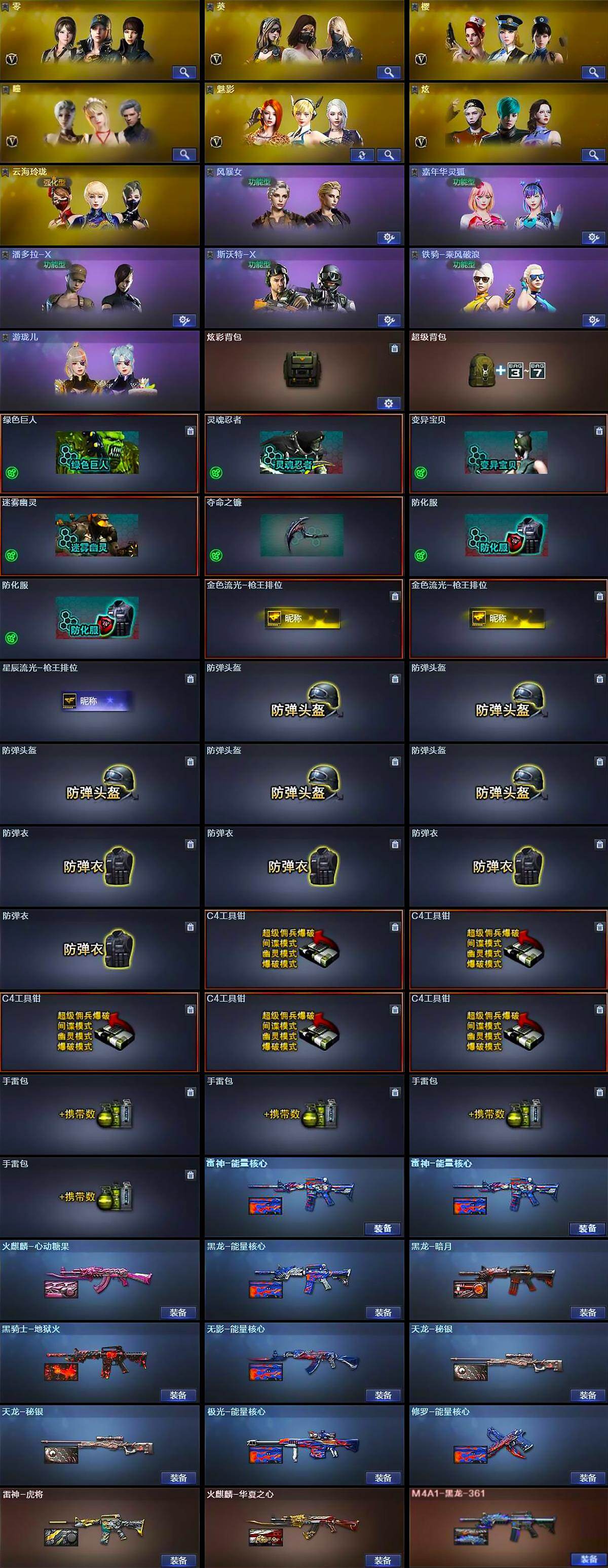 - [16475008]四川一区-13V-0王者-0炫金 【热门武器】:M4A1-青龙,M200-幻神,C.A.T,沙鹰-修罗 【皮肤】:幻神-冠军之幻,幻神-电竞之星 皮肤,黑骑士-AG-S4冠军典藏 【角色】:隼,王者玲珑,云海玲珑,北极狐-X,娟娟,灵狐者-X,潘多拉-X,潘多拉-甜心教官 【人偶武器】:C.A.T,灵狐娃娃手雷 【挑战大师】:激光毁灭者III-白马银枪 【英雄级武器】:AK47-黑鲨,M4A1-青龙,黑骑士-海王,M200-幻神,烈龙-云海游龙,沙鹰-修罗,沙鹰-天神,擎天-云海游龙,手雷-云海游龙 【道具】:云海游龙炫彩背包,绿色巨人,灵魂忍者,迷雾幽灵,夺命之镰*2,防化服*2,金色流光-枪王排位,星辰流光-枪王排位,云海游龙表情,防弹头盔*2,防弹衣*2,C4工具钳*2,手雷包*2 【特殊枪械】: