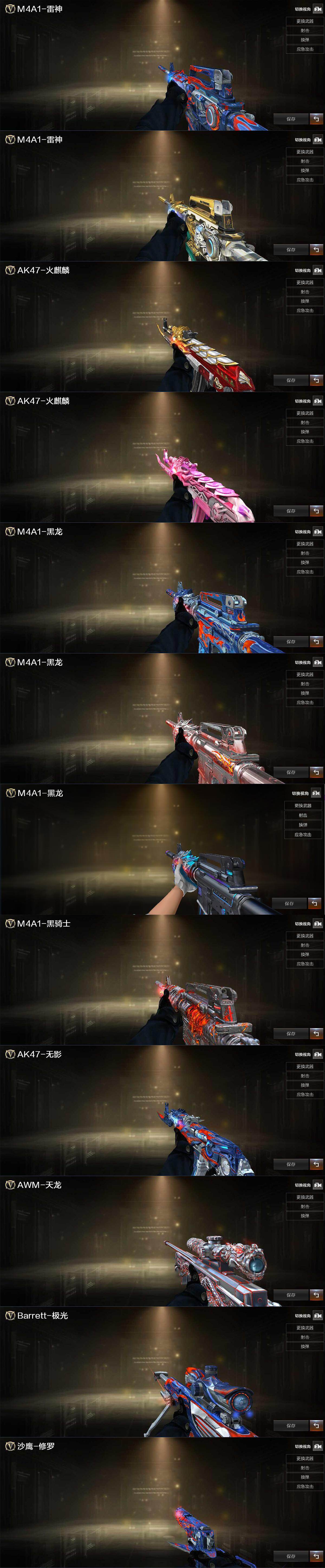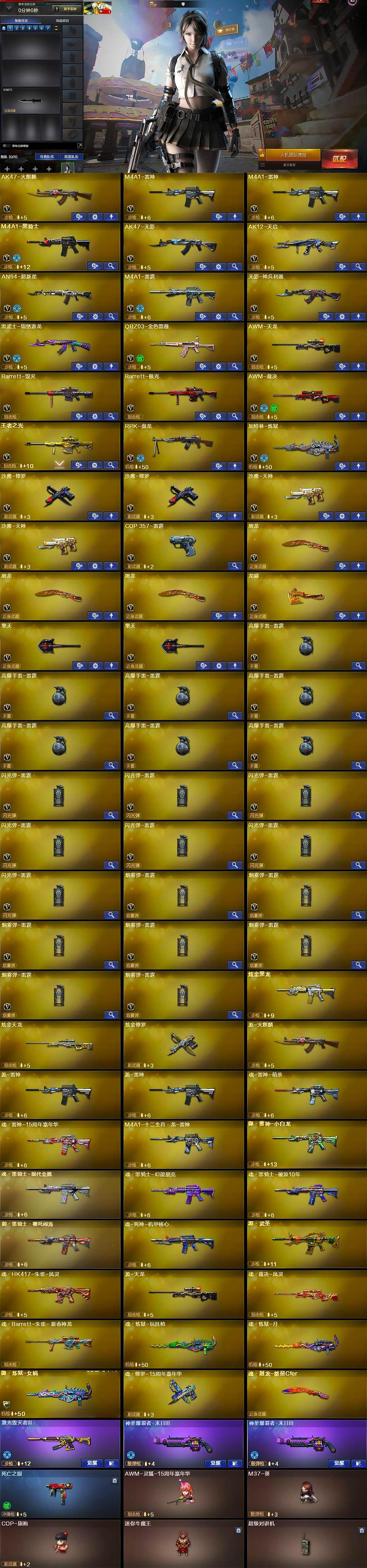 【英雄级武器】:AK47-火麒麟,M4A1-雷神*2,M4A1-黑骑士,AK47-无影,AK12-天启,AN94-超新星,M4A1-雷霆,无影-神兵利器,黑武士-锦绣游龙,QBZ03-金色蔷薇,AWM-天龙,Barrett-毁灭,Barrett-极光,AWM-裁决,王者之光-觉醒版,RPK-盘龙,加特林-炼狱,沙鹰-修罗*2,沙鹰-天神*2,COP-雷霆,屠龙*3,龙啸,擎天*2,高爆手雷-雷霆*7,闪光弹-雷霆*7,烟雾弹-雷霆*7