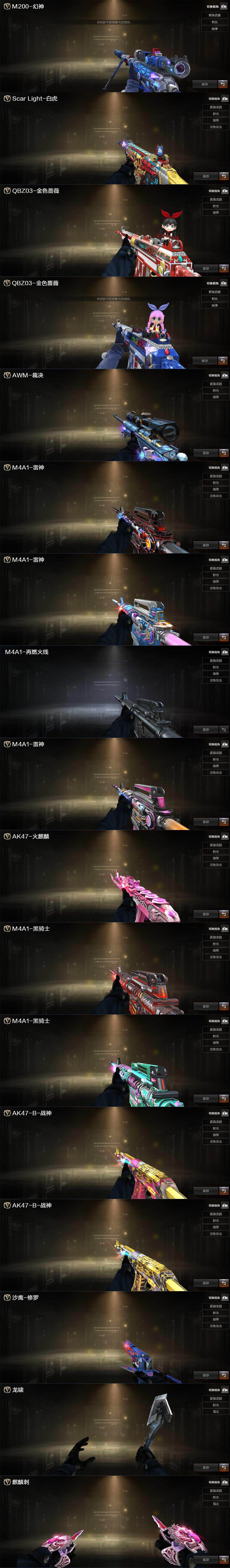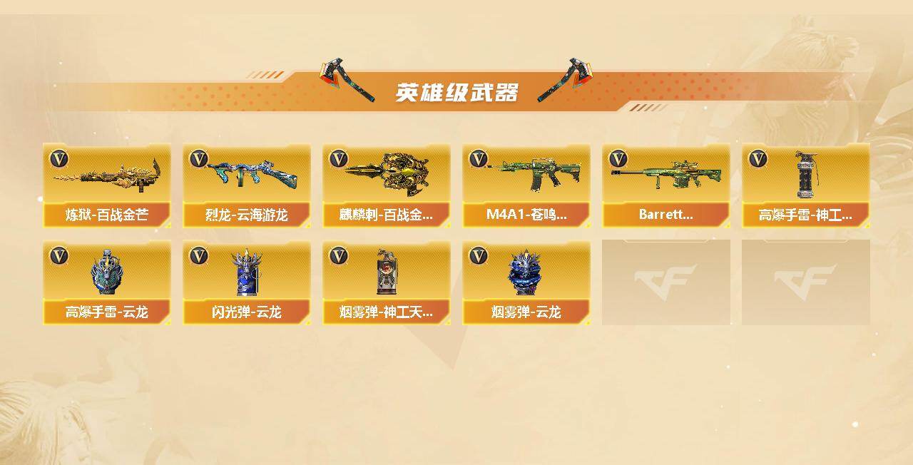 【英雄级武器】:AK47-火麒麟,M4A1-雷神,M4A1-黑骑士,AK47-机械迷城,无影-神兵利器,QBZ03-云龙,黑武士-锦绣游龙,QBZ03-金色蔷薇,烈火-动感闪耀,王者之势-觉醒版,AK-47-猩红传说*2,王者之城-觉醒版,白虎-电玩蓝兔,AWM-天龙,Barrett-毁灭,Barrett-朱雀,炼狱-百战金芒,烈龙-云海游龙,沙鹰-修罗,COP 357-云龙,天神-动感闪耀,屠龙,麒麟刺,屠龙-动感闪耀,麒麟刺-百战金芒,高爆手雷-神工天巧,手雷-动感闪耀,高爆手雷-云龙*2,闪光弹-云龙,烟雾弹-神工天巧,烟雾弹-云龙,M4A1-赤狱骑士,M4A1-苍鸣雷神,Barrett-碧霄极光